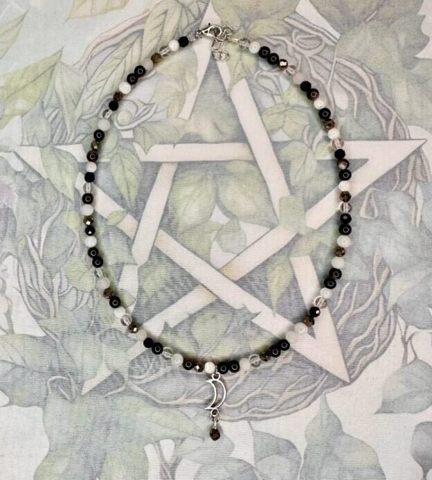 One of a kind 4mm Choker length beaded necklace with crescent moon charm and faceted pyrite, faceted black tourmaline, faceted onyx, moonstone, clear quartz and matte white jade