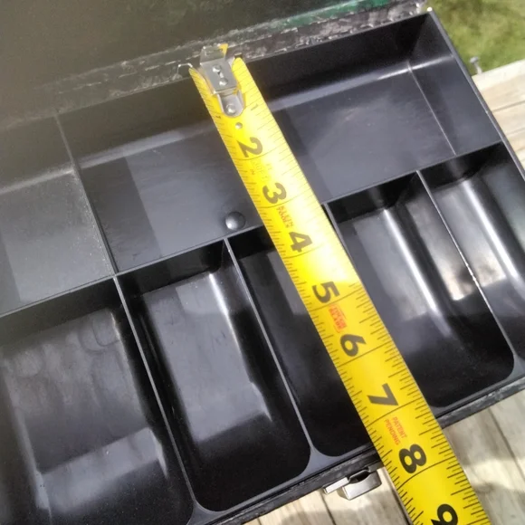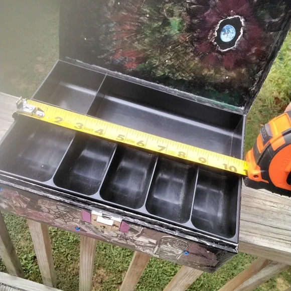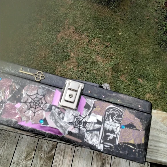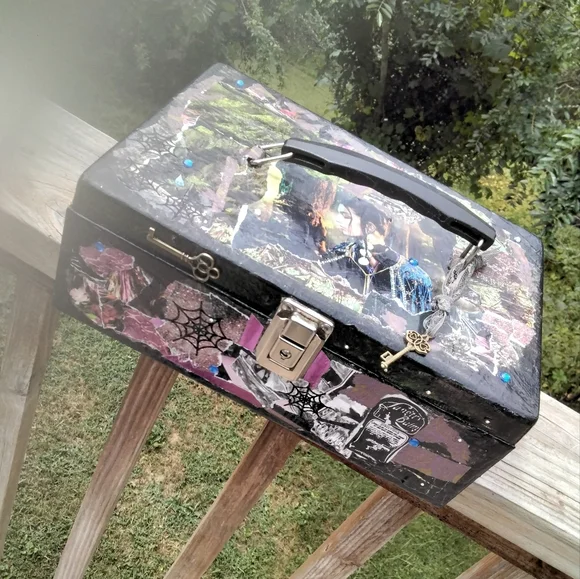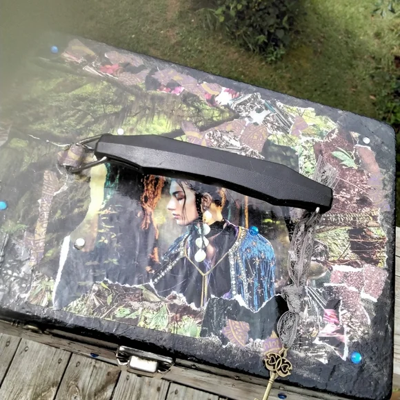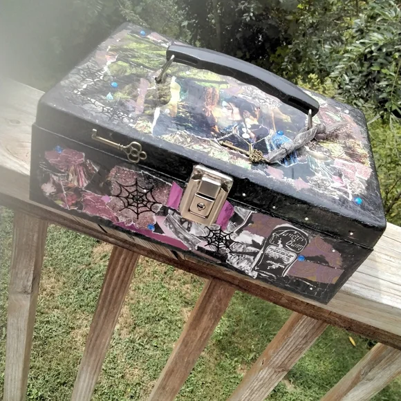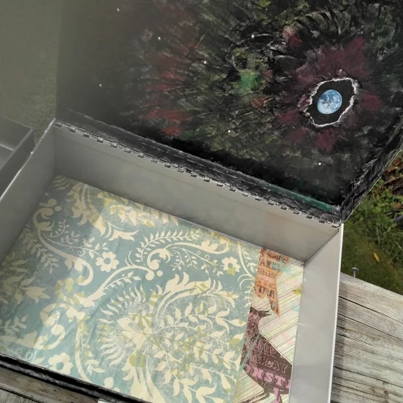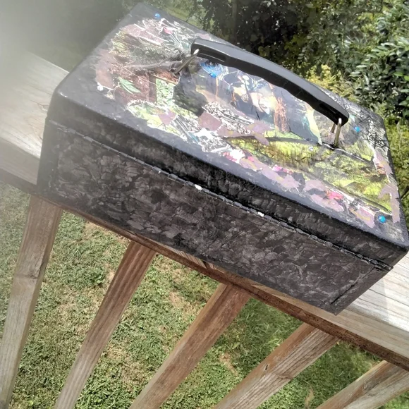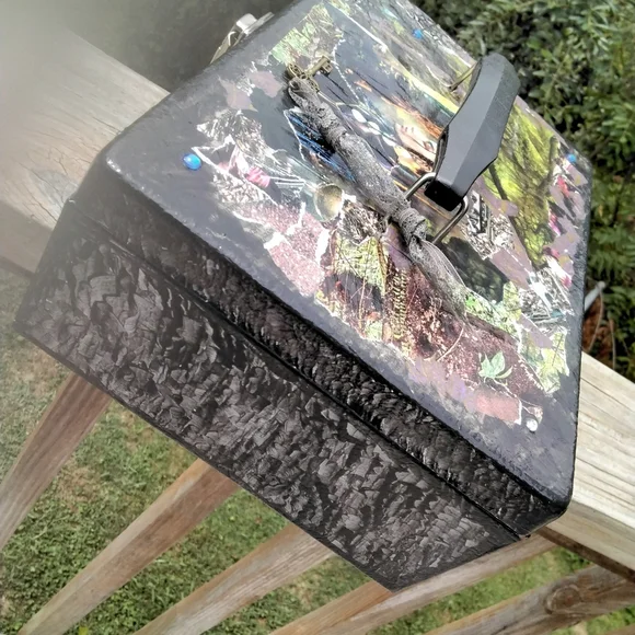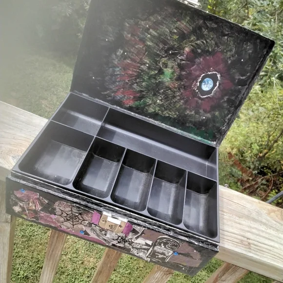 One of a kind!.. handmade..began as a metal cash box, ended as the perfect spot for keepsakes, alter items, makeup or a very stand out cash box! Tray insert is included. Box snaps shut as it should, can be carried, tossed around, taken to events etc, but I do not have the lock key for this one. (buyer could have a locksmith create a key) Hard to photograph but this piece has many color reflecting mini gems throughout this piece. ** Keep record if using for a business=deduction! OOAK. NONE LIKE THIS IN THE WORLD. FOUND OBJECTS ART. Sealed with a waterproof coating, may be cleaned using a lightly damp cloth..