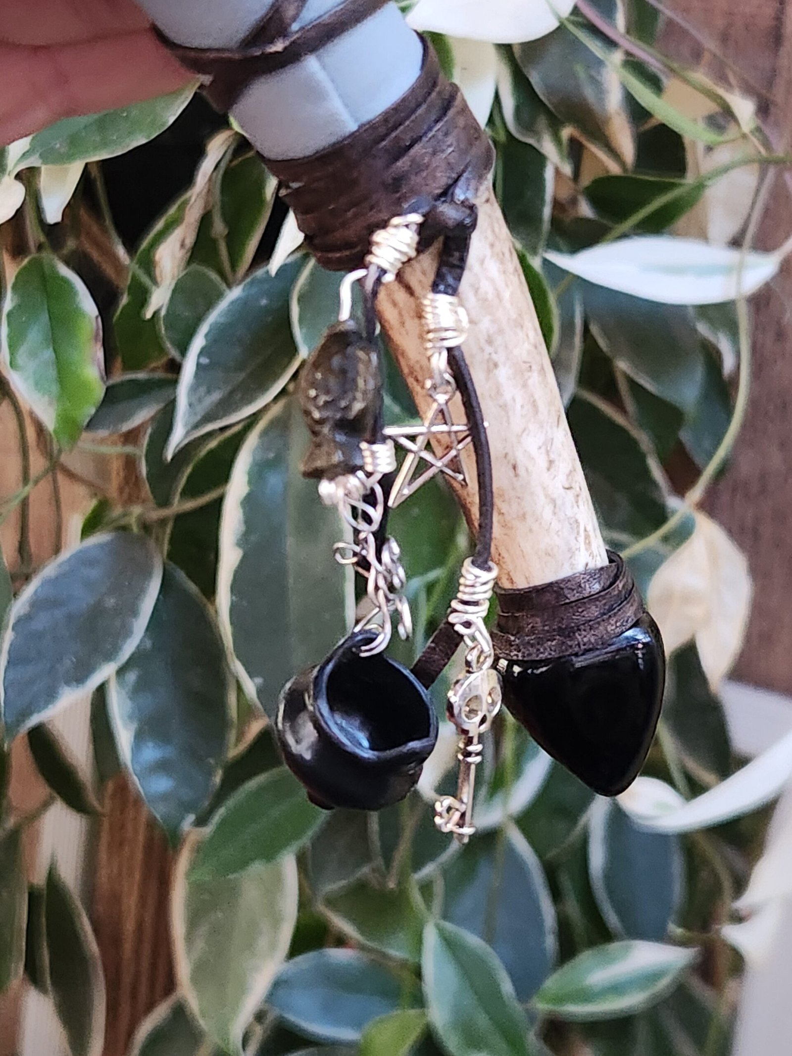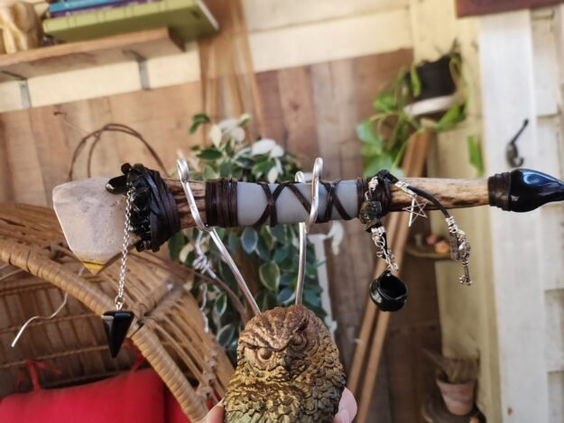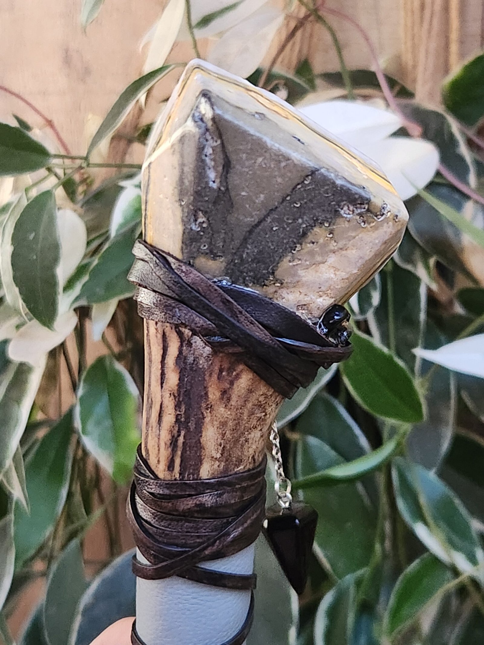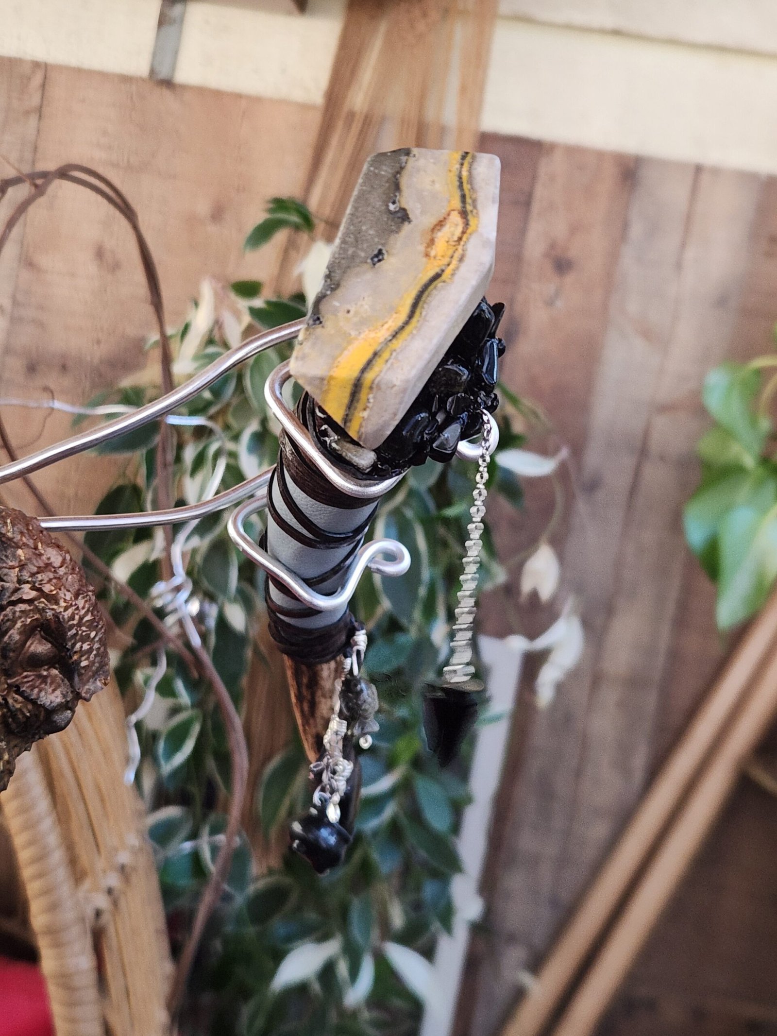 This striking and bold Bumble Jasper with Golden Sheen Obsidian accents makes up this handsome Divination Bone Wand with its Obsidian pendulum. The handle is made of deer antler, and wrapped in both vinyl and genuine leather, and is completed with an array of charms.