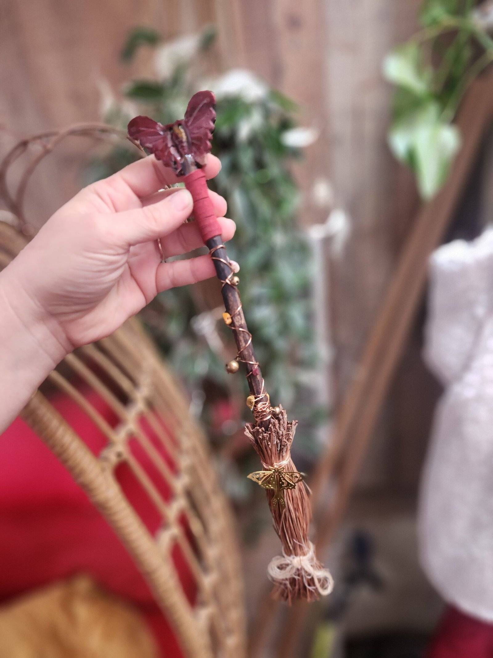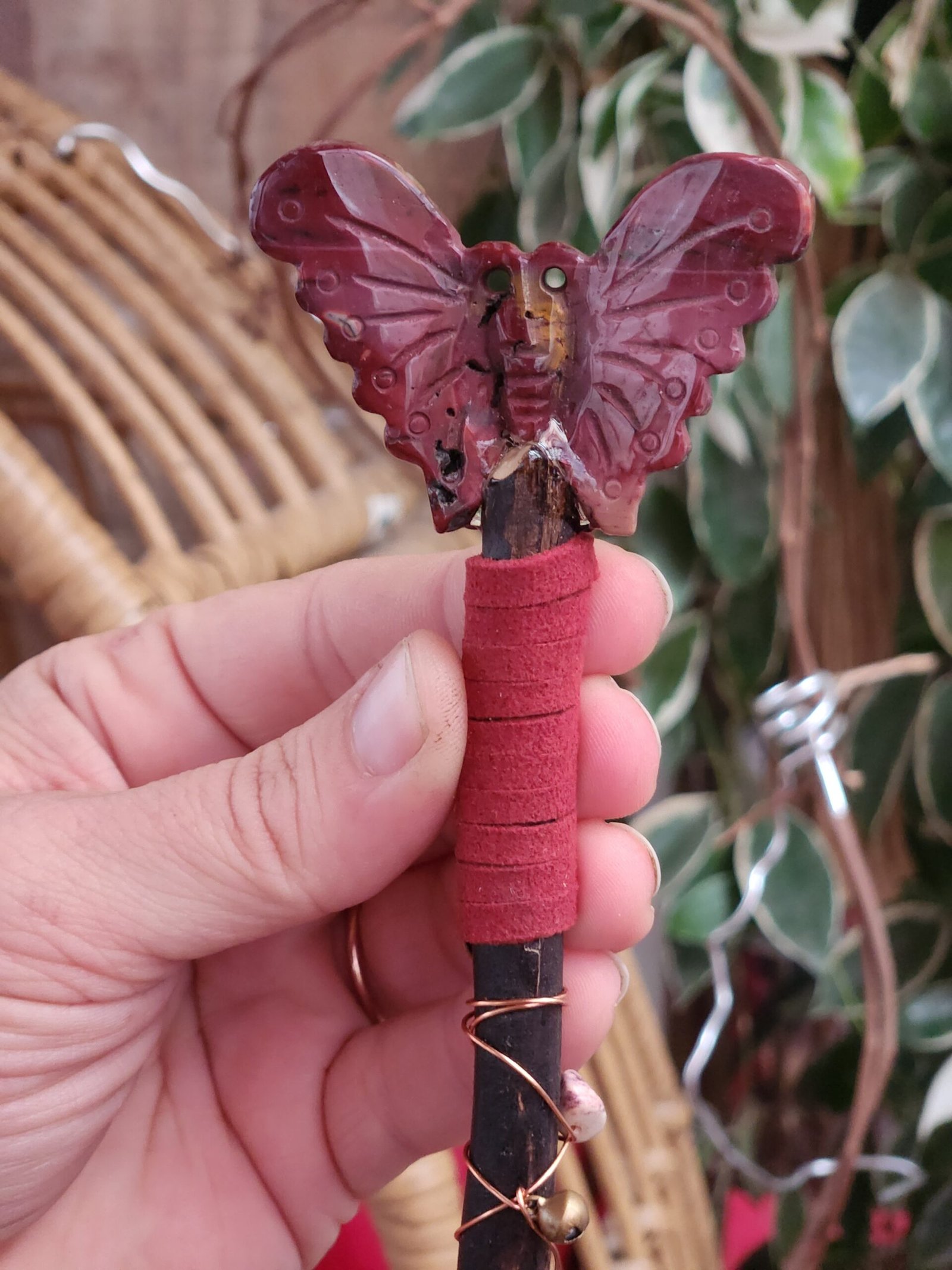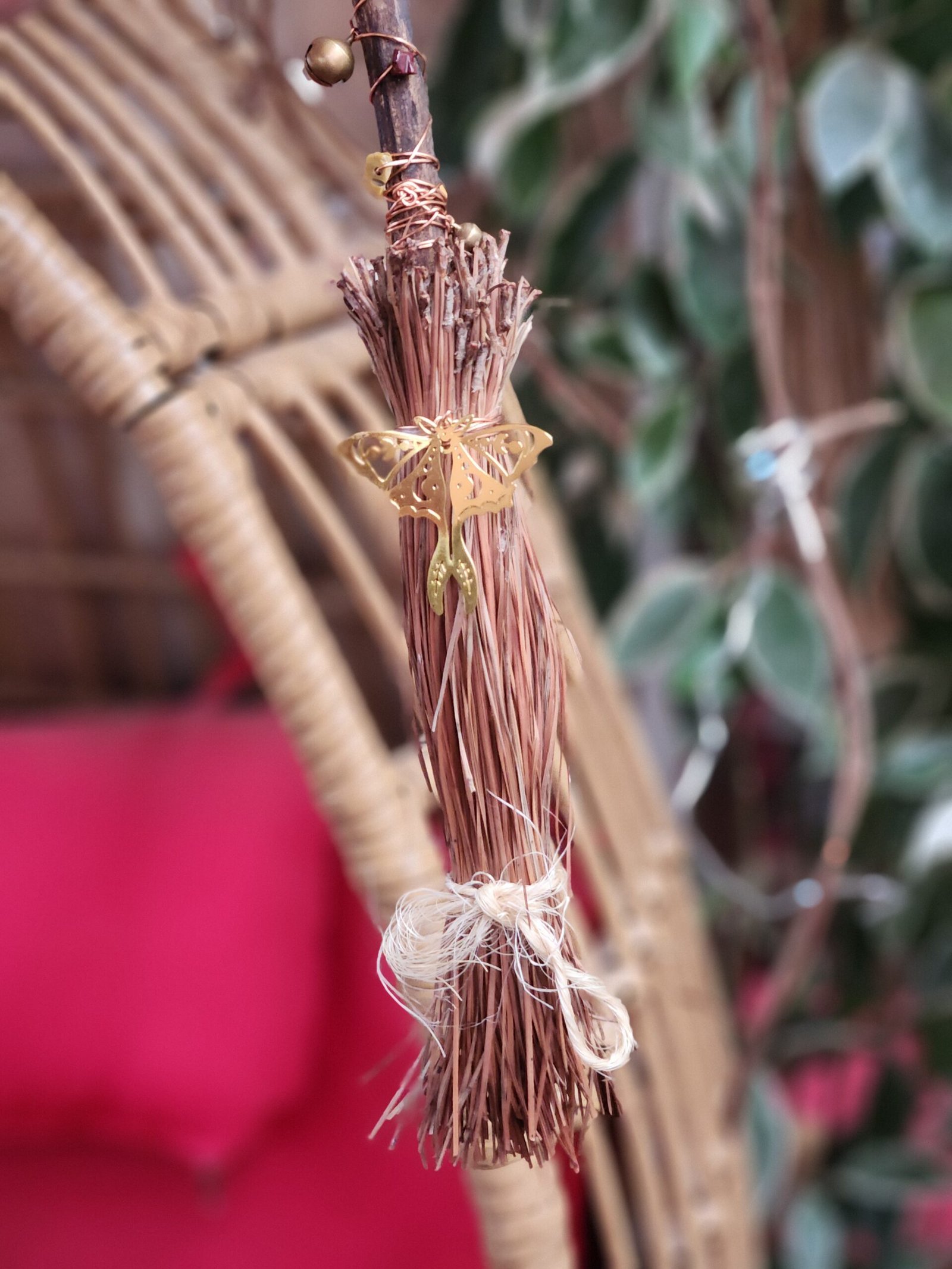This mini alter Broom has a fun Maroon colored Mookite crystal butterfly sitting ontop of its handle, that is decorated with copper wire, bells, and more mookite chip beads, as well as a luna moth charm.