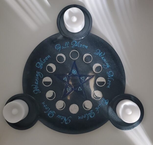 This candle holder has a diameter of 10in. Letters, symbols, moon phases, and base color are all customizable.