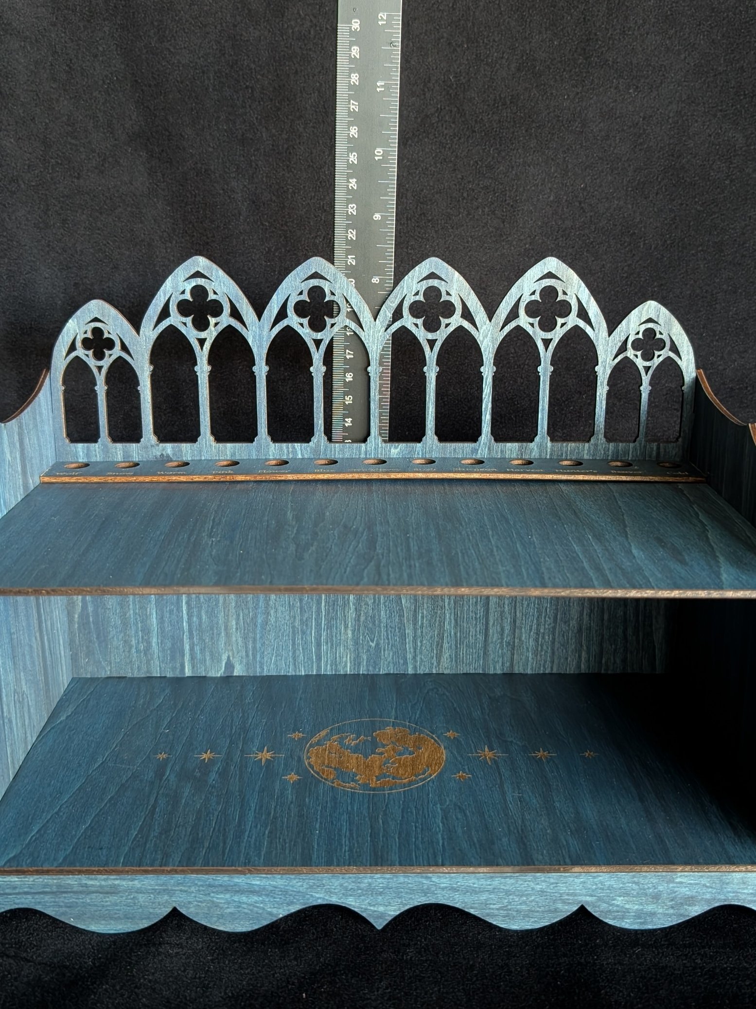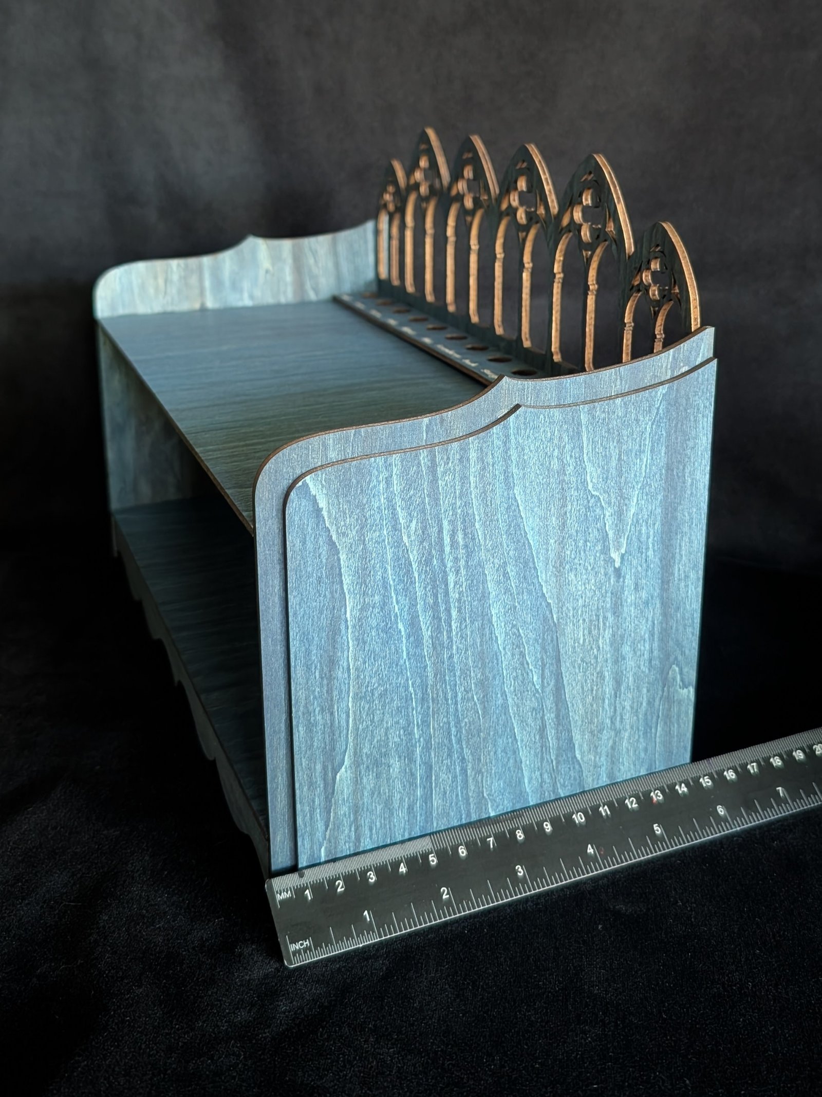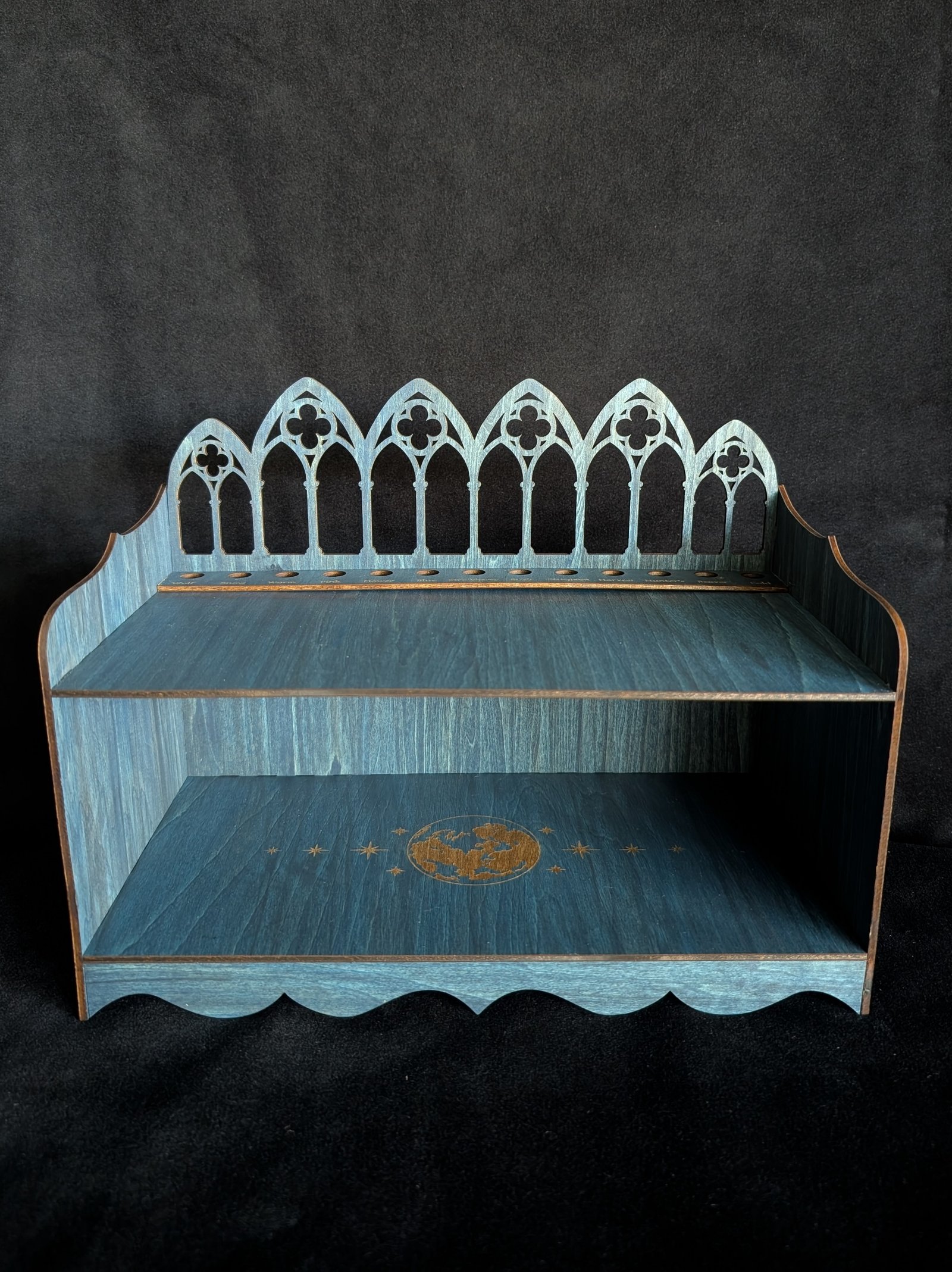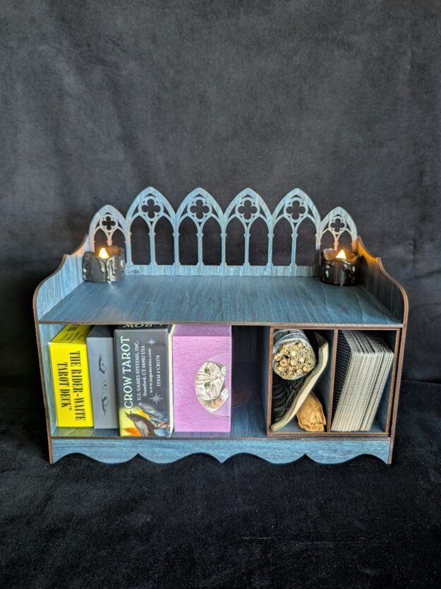 Summon order from the beautiful chaos of your tarot practice with this hand-stained Celestial Blue Tarot Deck Storage Shelf, designed and crafted entirely by me for witches who love deep tones, quiet ritual, and thoughtful details.