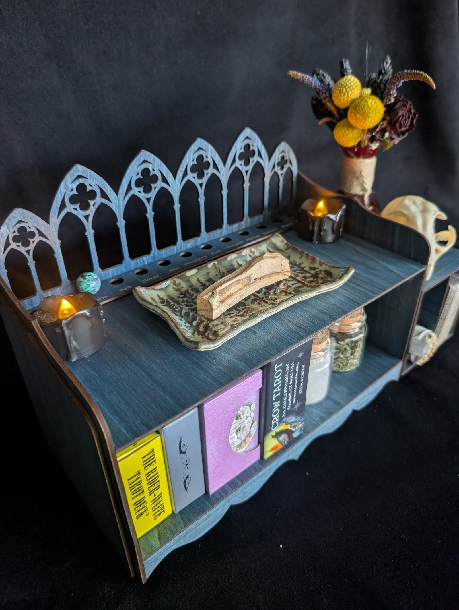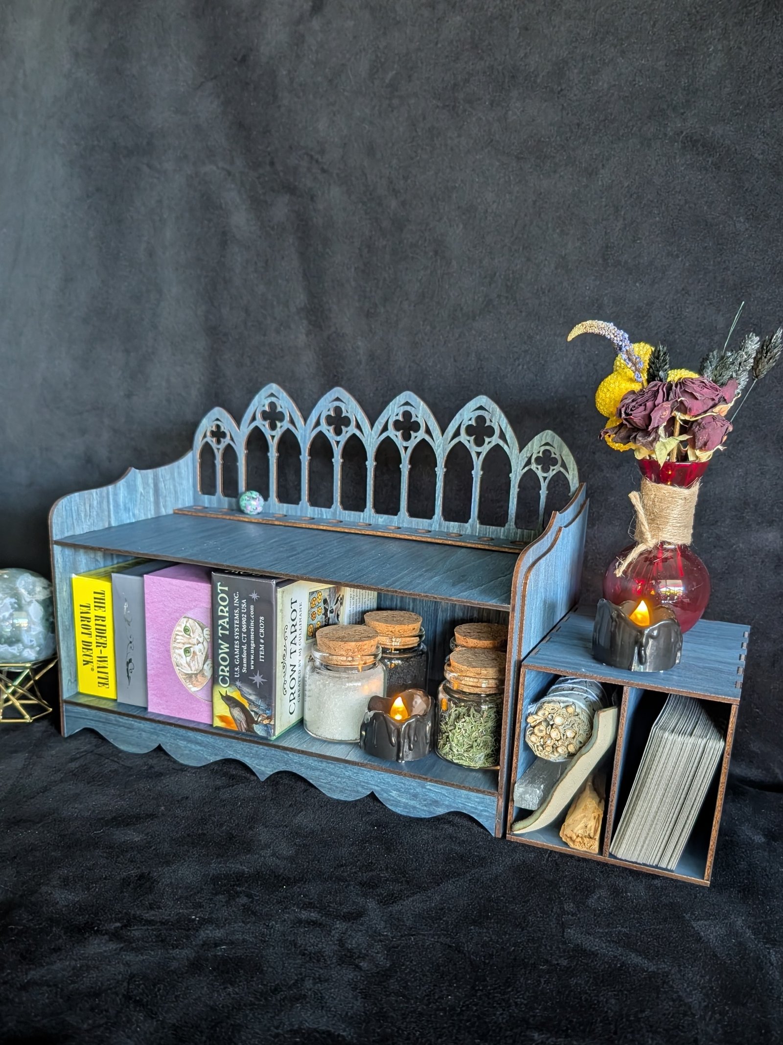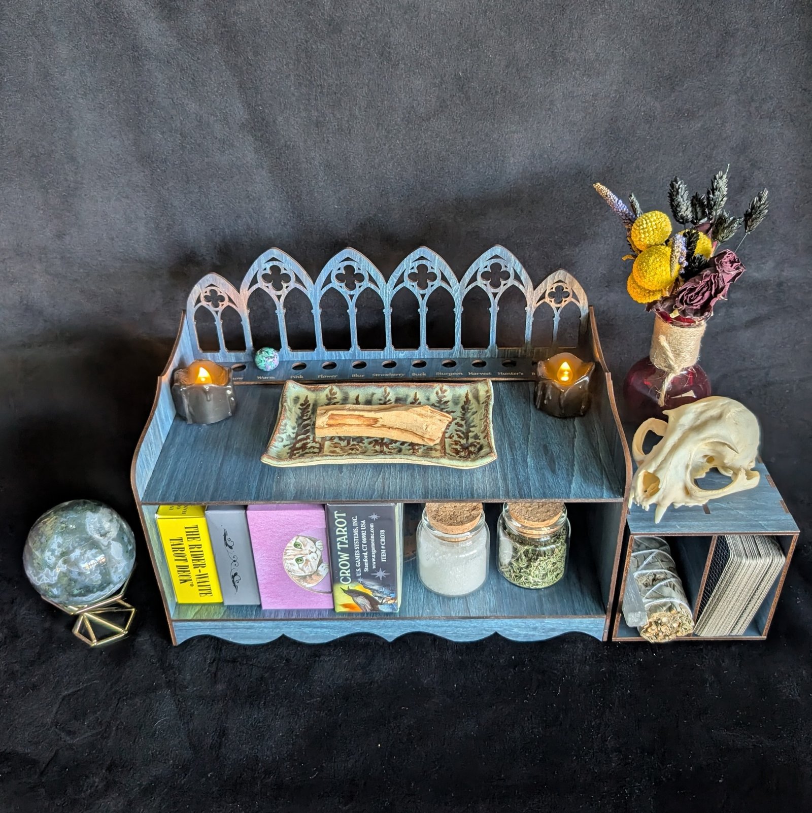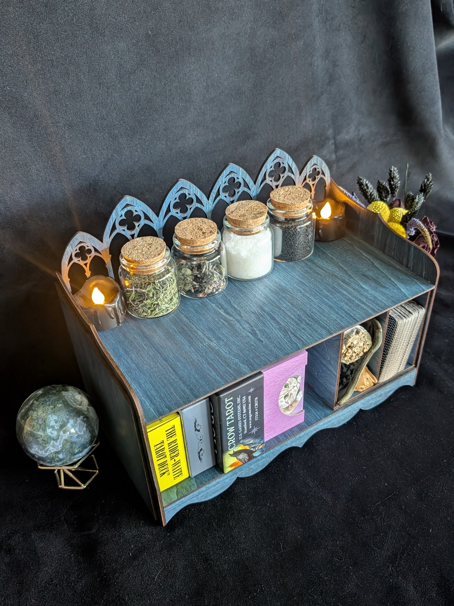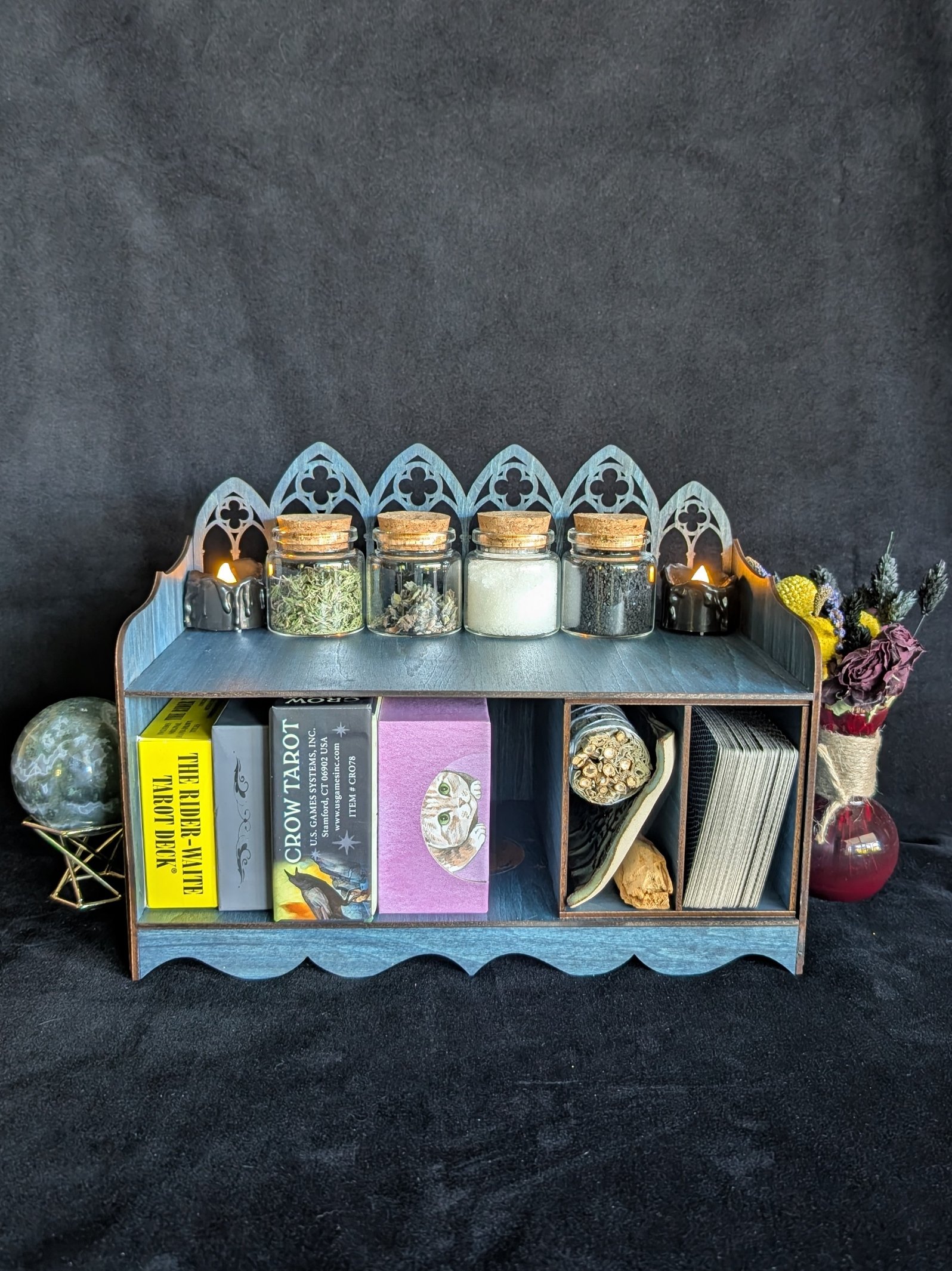 The removable cubby is perfect for loose tarot decks, oracle cards, sage bundles, palo santo, selenite, tarot cloths, apothecary jars, or spell tools, allowing you to rearrange the shelf to suit your practice.