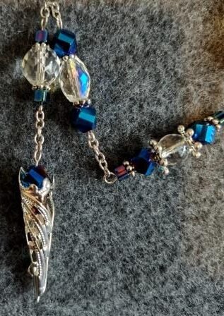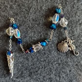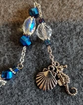 For this beauty I have used a combination of clear and blue faceted glass beads, finished off with a pair of seaworthy charms – one being a shell, the other a seahorse. This pendulum measures 11 inches long.
