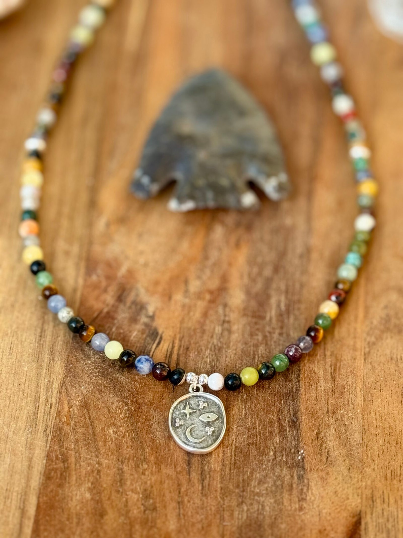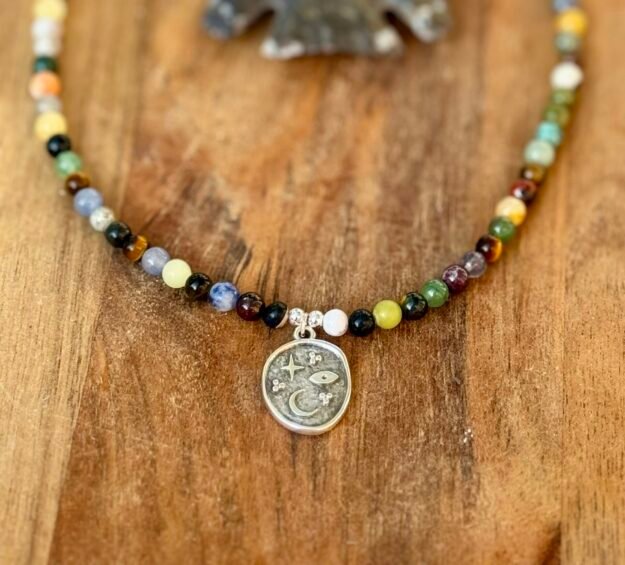 gemstone/crystal necklace in 4mm mix stones with sterling silver accent beads. example of stones used are: red jasper, dalmation jasper, clear quartz, sandstone, sodalite, lapis, adventurine, citrine, rose quartz, moss agate, tiger eye, calcites, picture jasper, labradorite, black tourmaline, black obsidian, jade, tree agate, unakite, etc. features a beautiful silver celestial charm with a moon, stars, and evil eye carving.