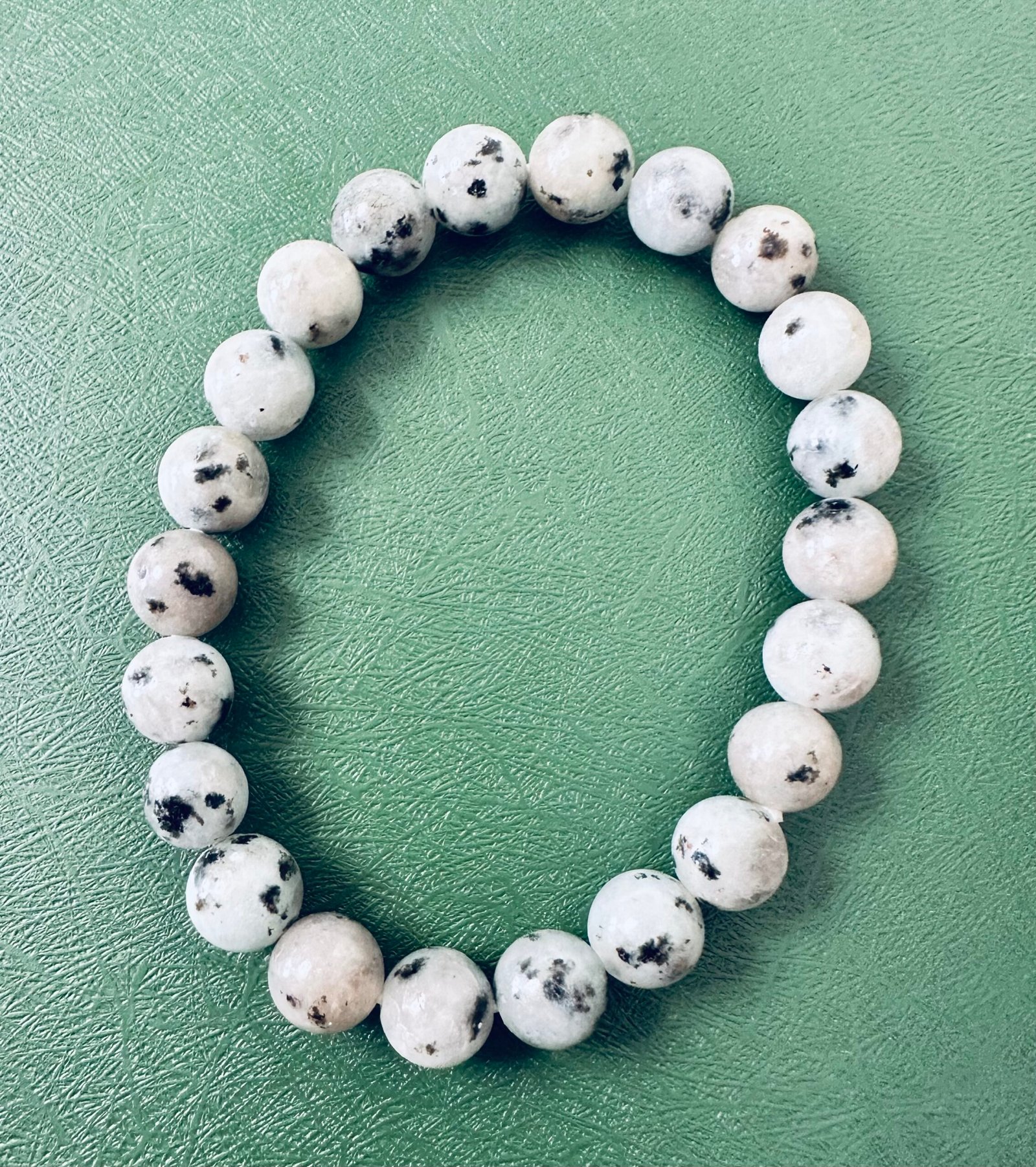 This Dalmatian Jasper bracelet features soft cream-colored beads naturally spotted with deep black inclusions, creating a playful yet grounding stone that’s truly one of a kind. Known for its uplifting and stabilizing energy, Dalmatian Jasper helps balance lighthearted joy with emotional grounding.