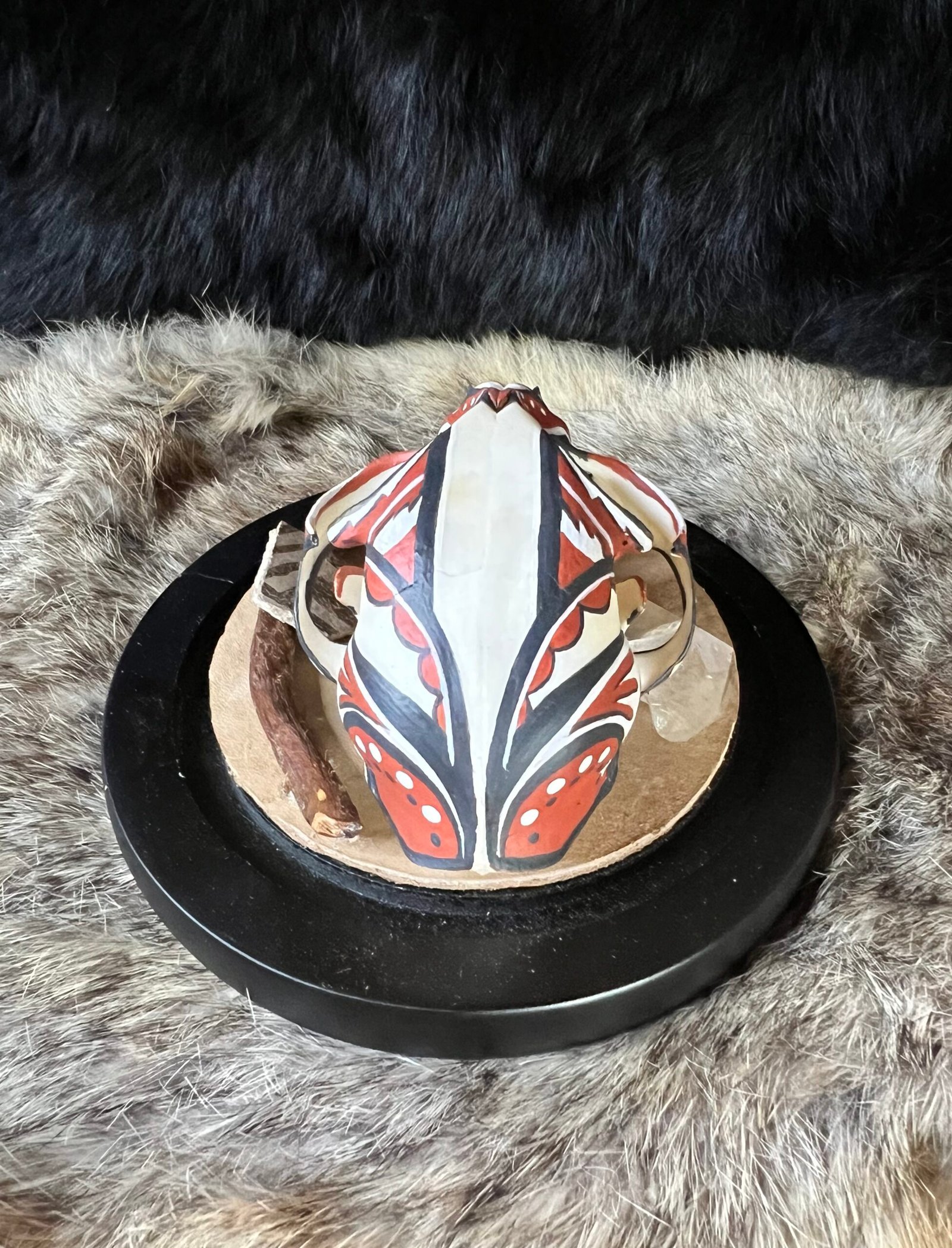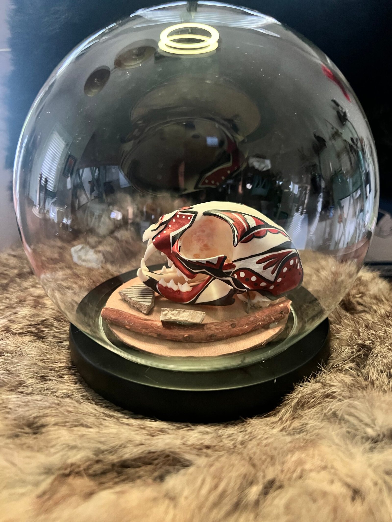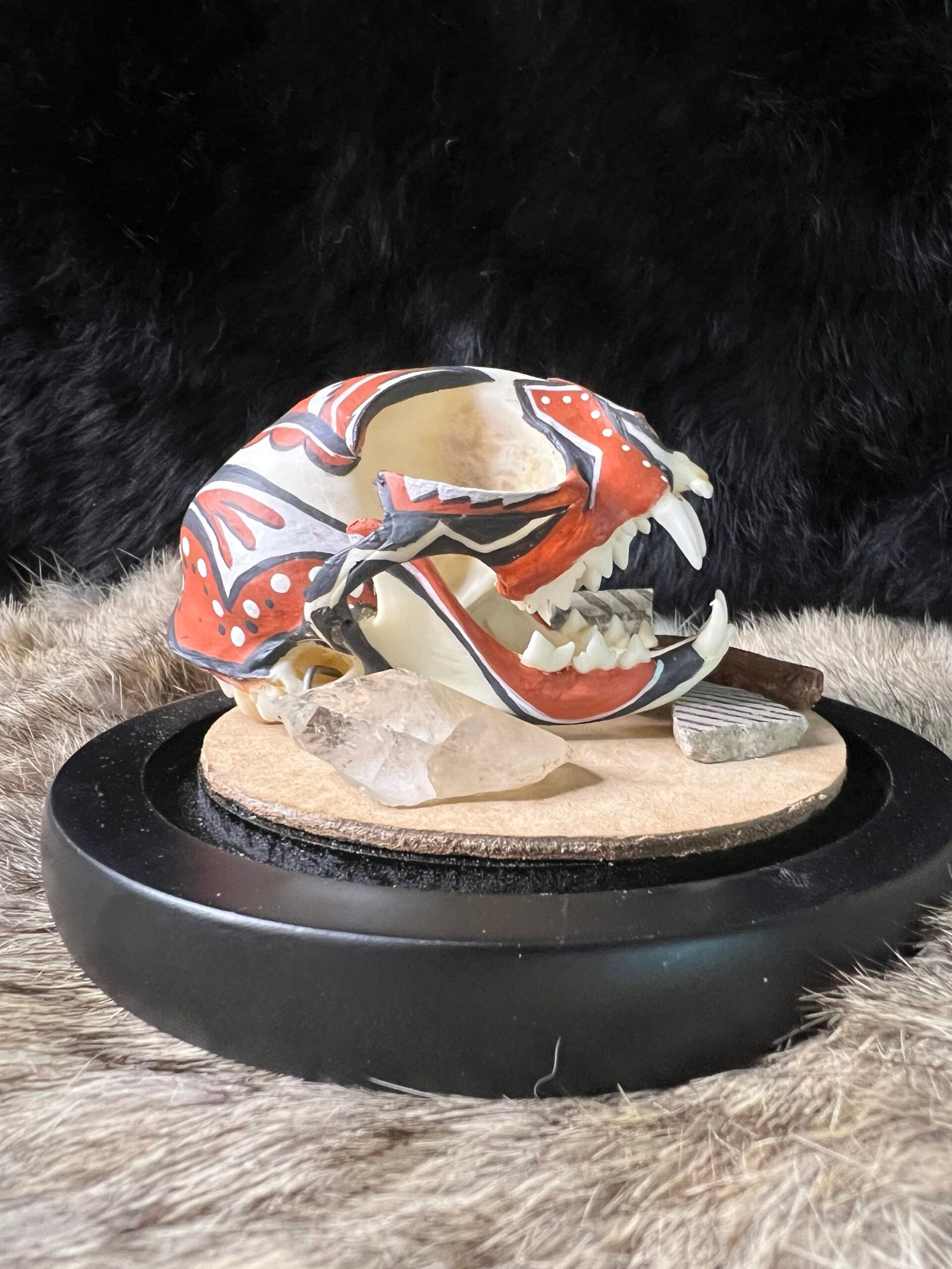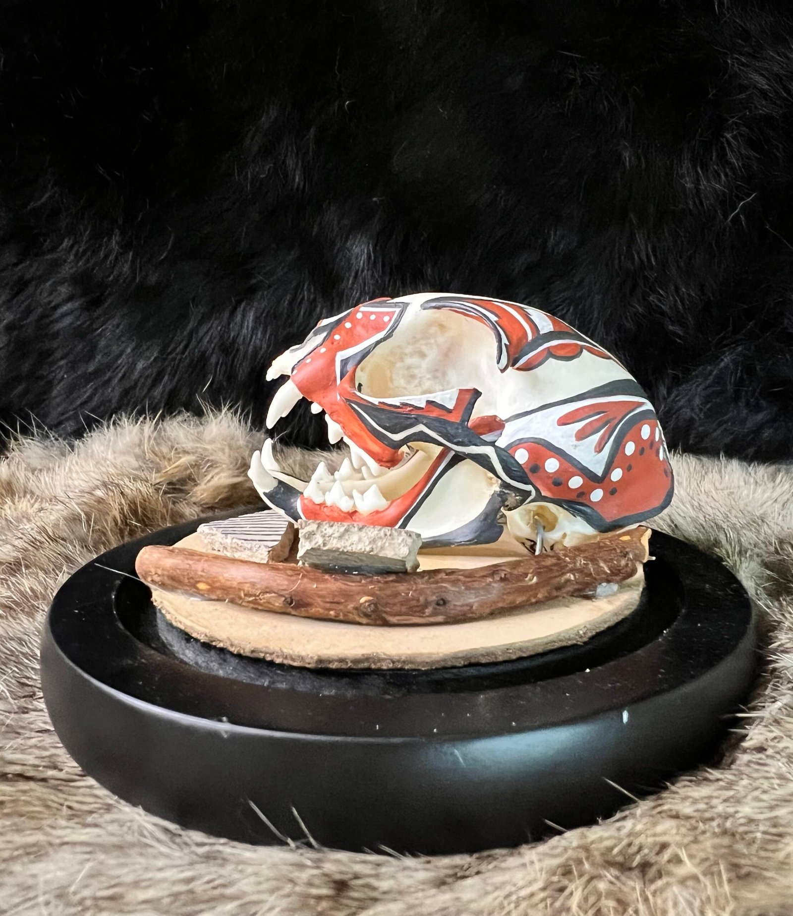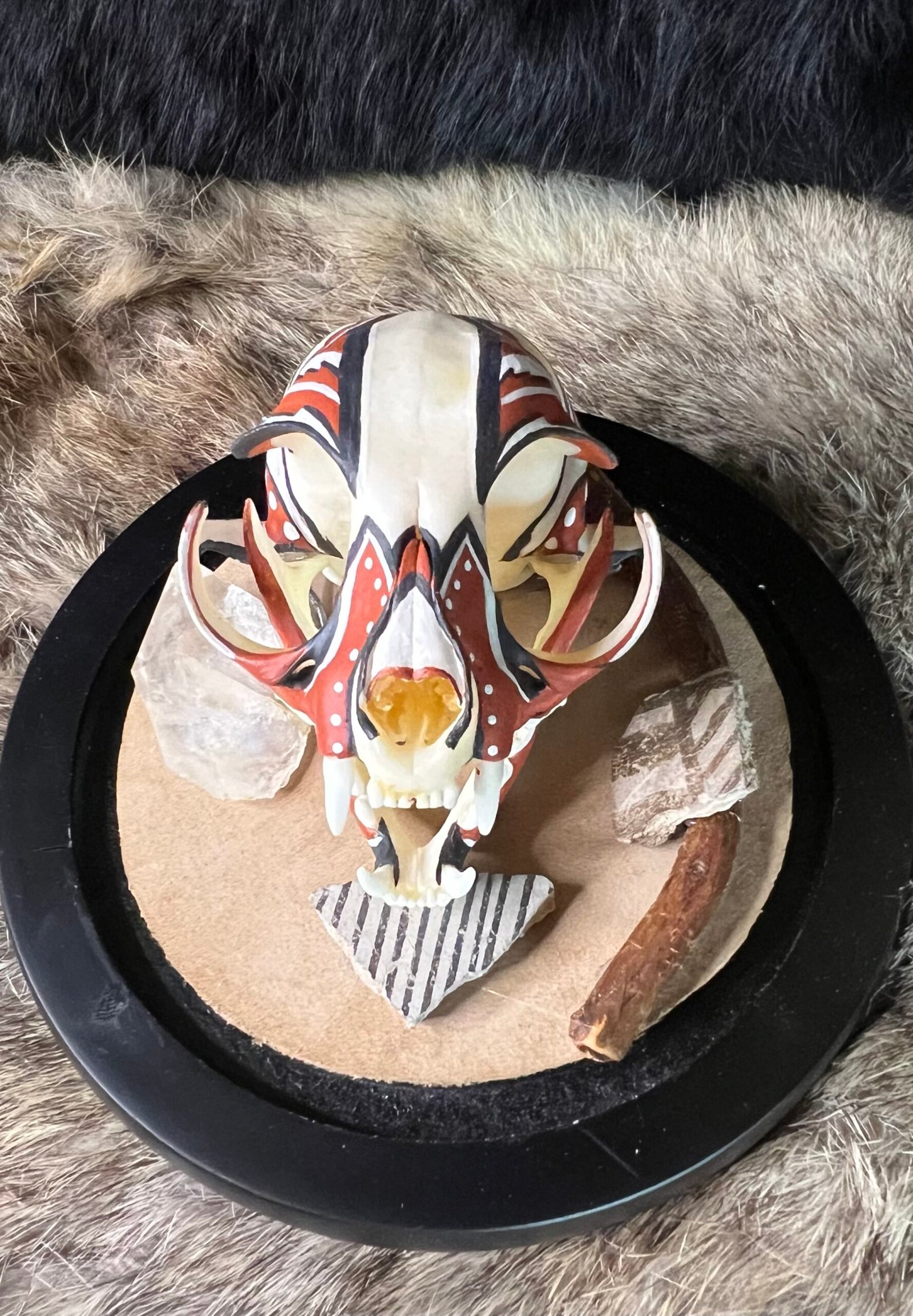 This is a one of a kind hand painted small bobcat skull by Diné / Navajo artist J.Jim. Featured with hand painted bobcat skull are two small pieces of Jornada Mogollon pottery shards (approx 1200 AD) collected on private property in the desert of New Mexico. This piece is mounted in a 6in glass globe to display and protect. Thank you for taking the time to look and supporting native art.