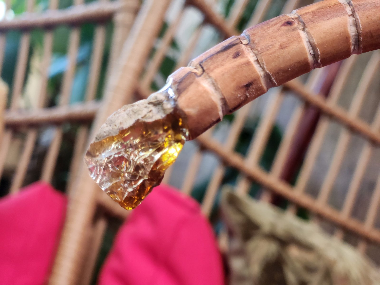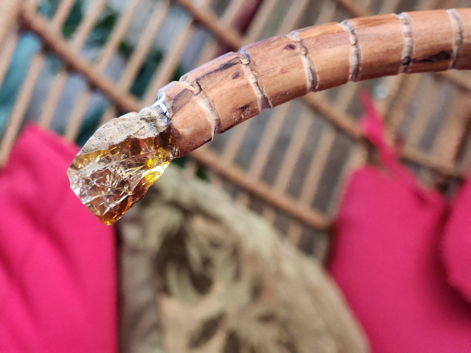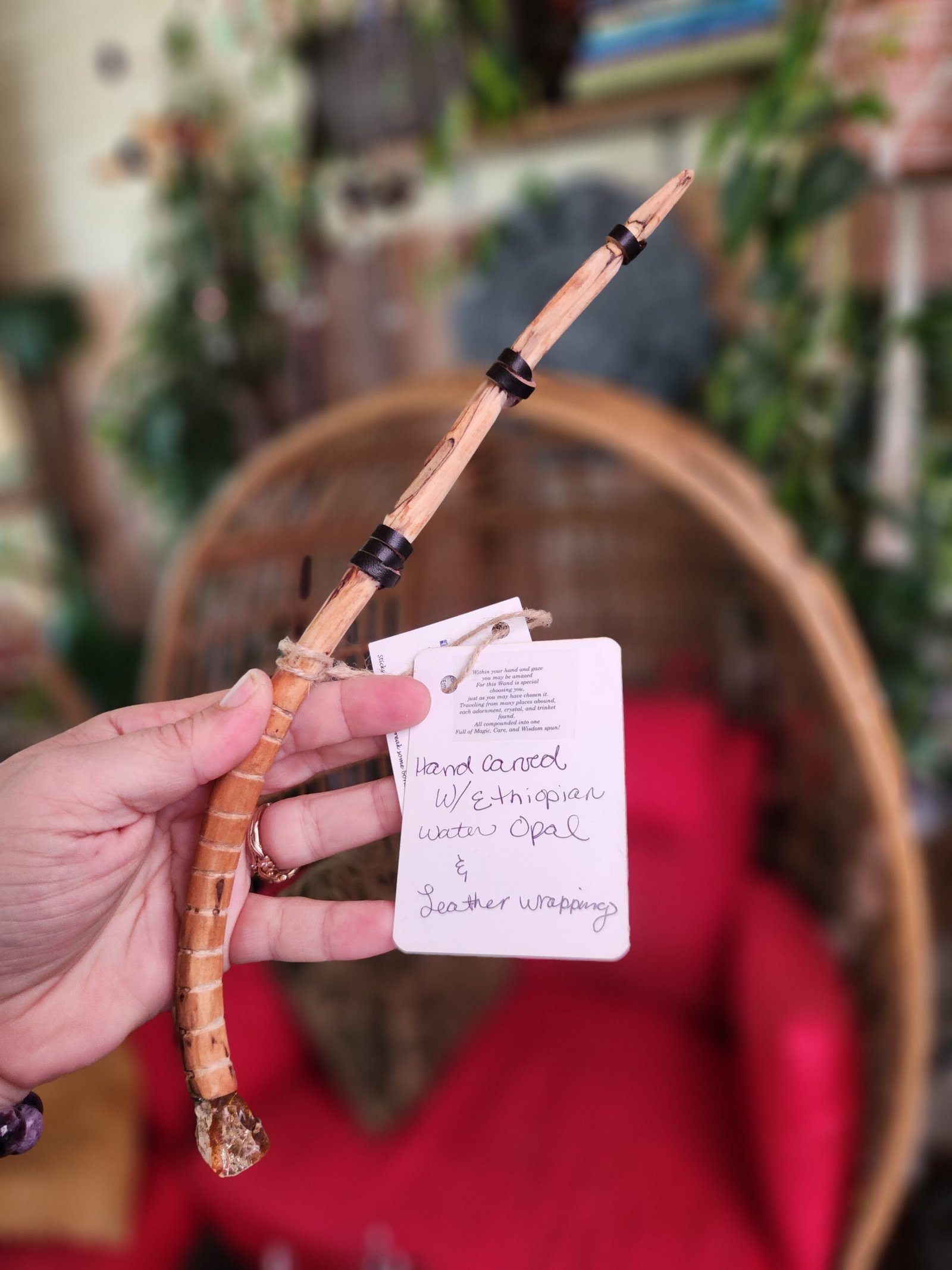 This wand is elegantly made. Crafted from Oak, hand carved handle for nice grip and texture. And tipped with a beautiful dried Opal in Amber hues.