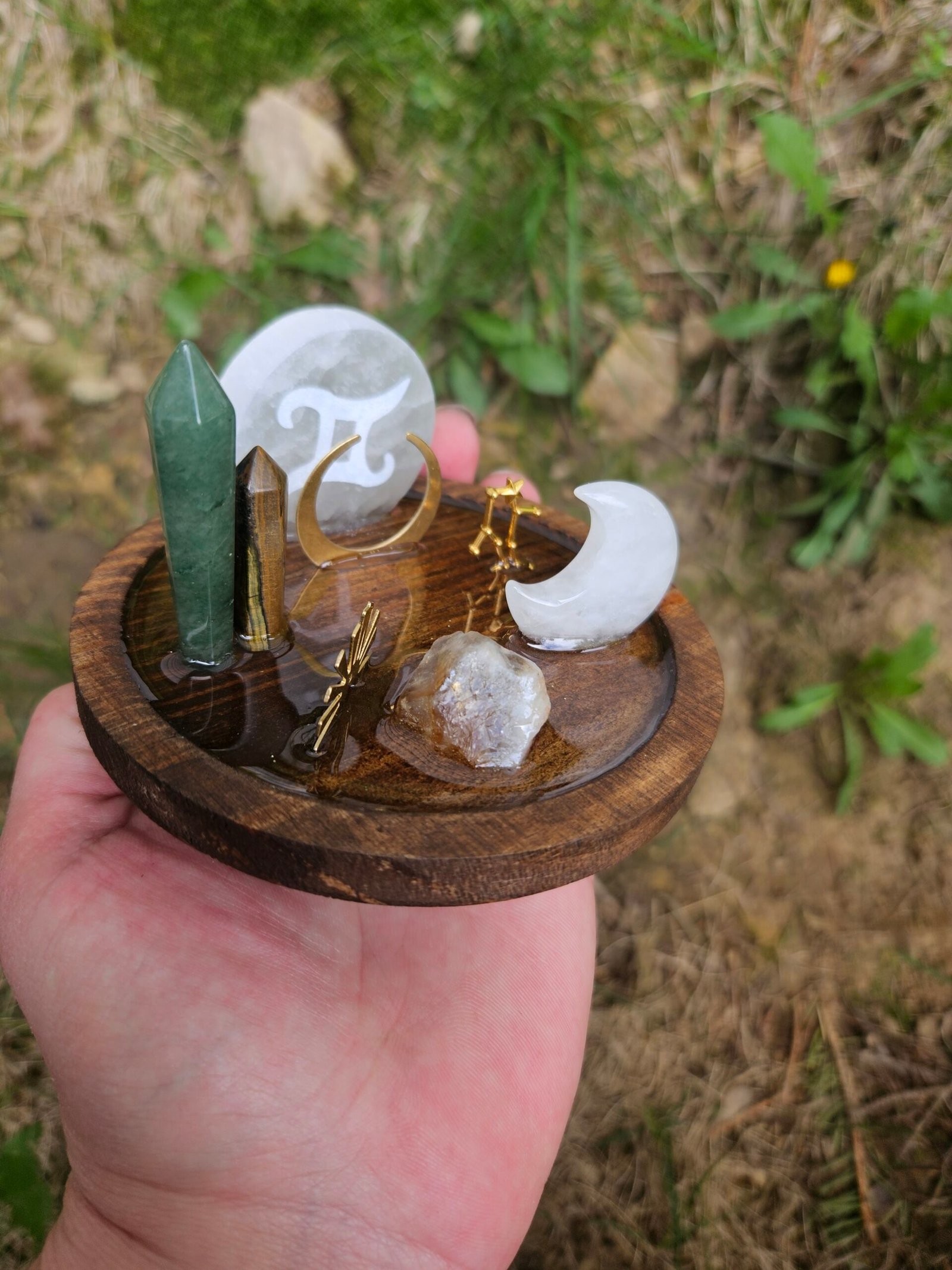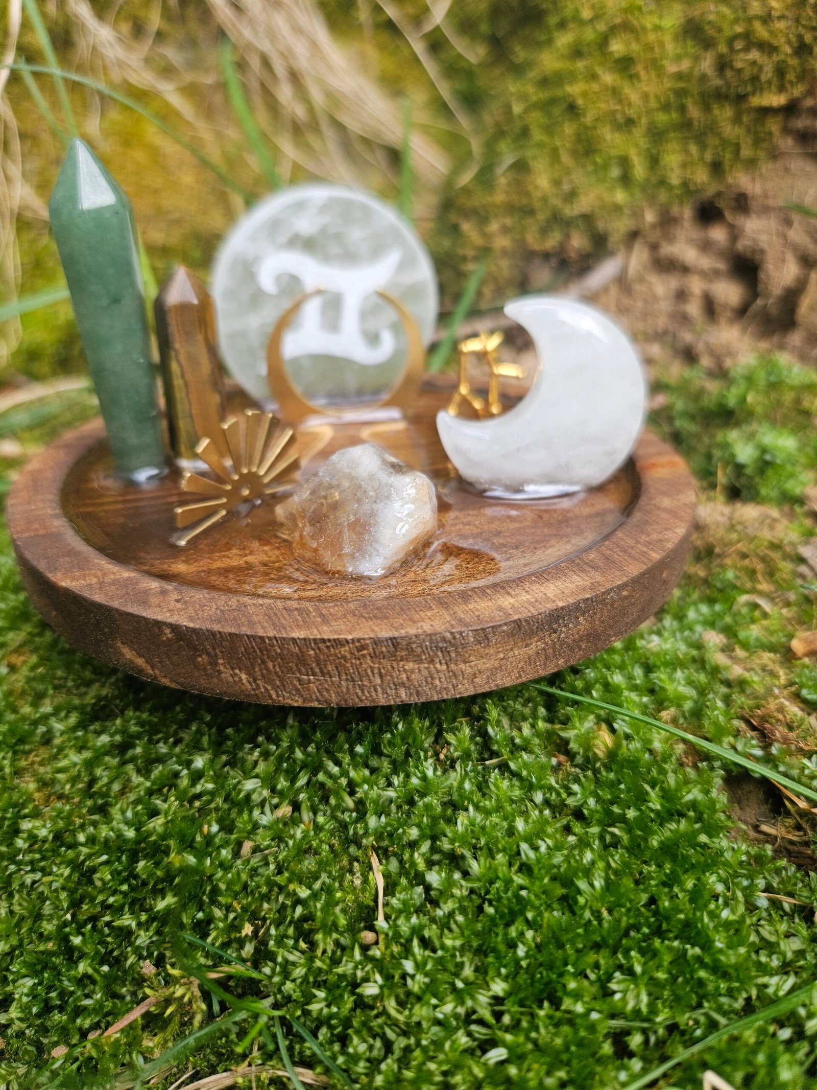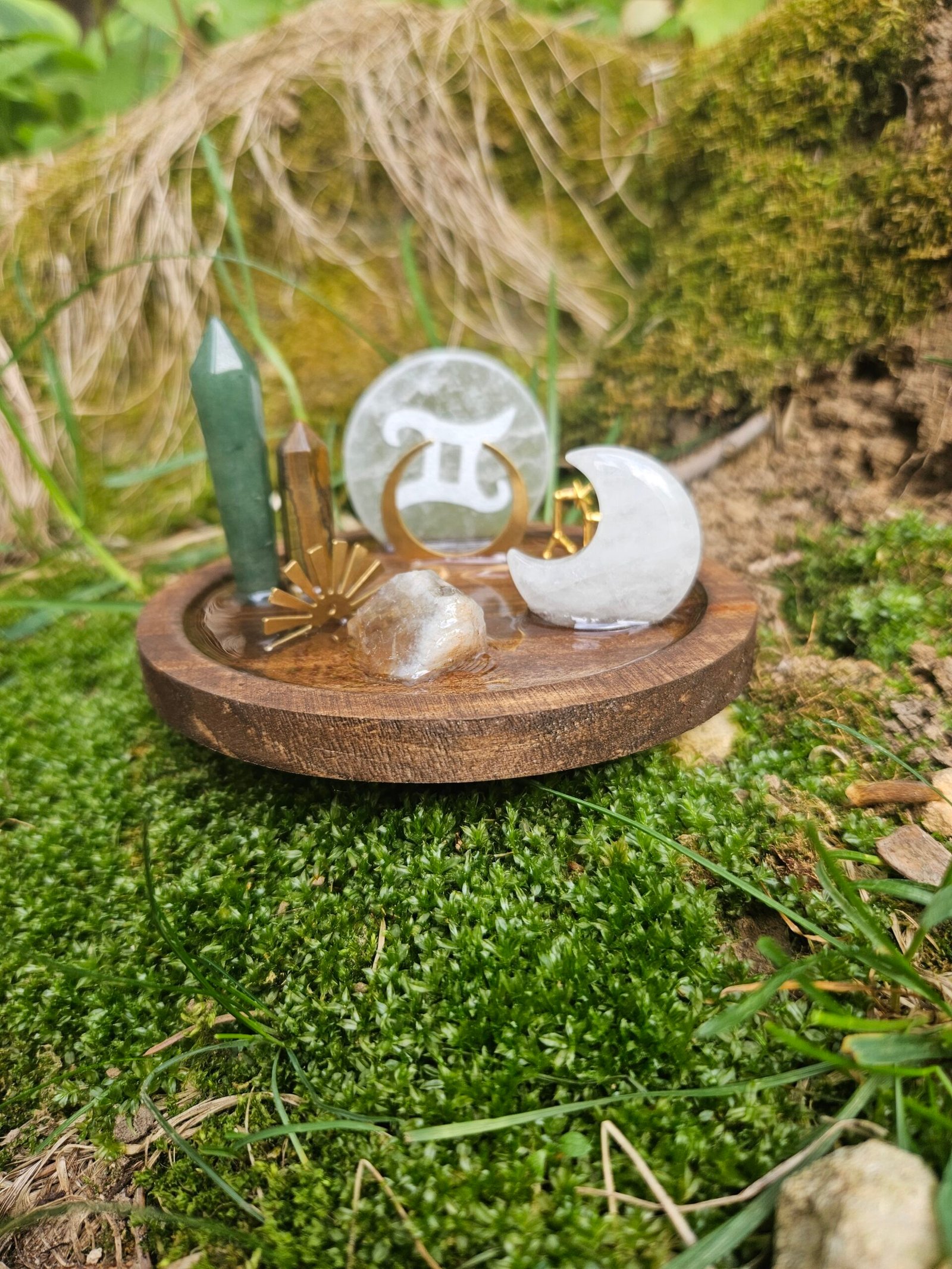 Add a touch of celestial charm to your space with our Gemini mini wooden round crystal decor. This unique piece is perfect for bringing positive energy and style to any room. Handcrafted with care, it makes a wonderful gift for astrology lovers and crystal enthusiasts. Elevate your home decor with this beautiful and meaningful item today! Roughly 4 inches, stained in dark walnut. Features the Gemini symbol etched in selenite, Raw Citrine, tigers eye mini tower, green adventurine mini tower, a clear quartz crescent moon, Celestial charms, and the Gemini constellation. Everything is held down with a thin layer of resin.