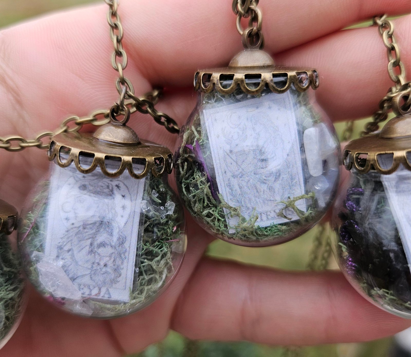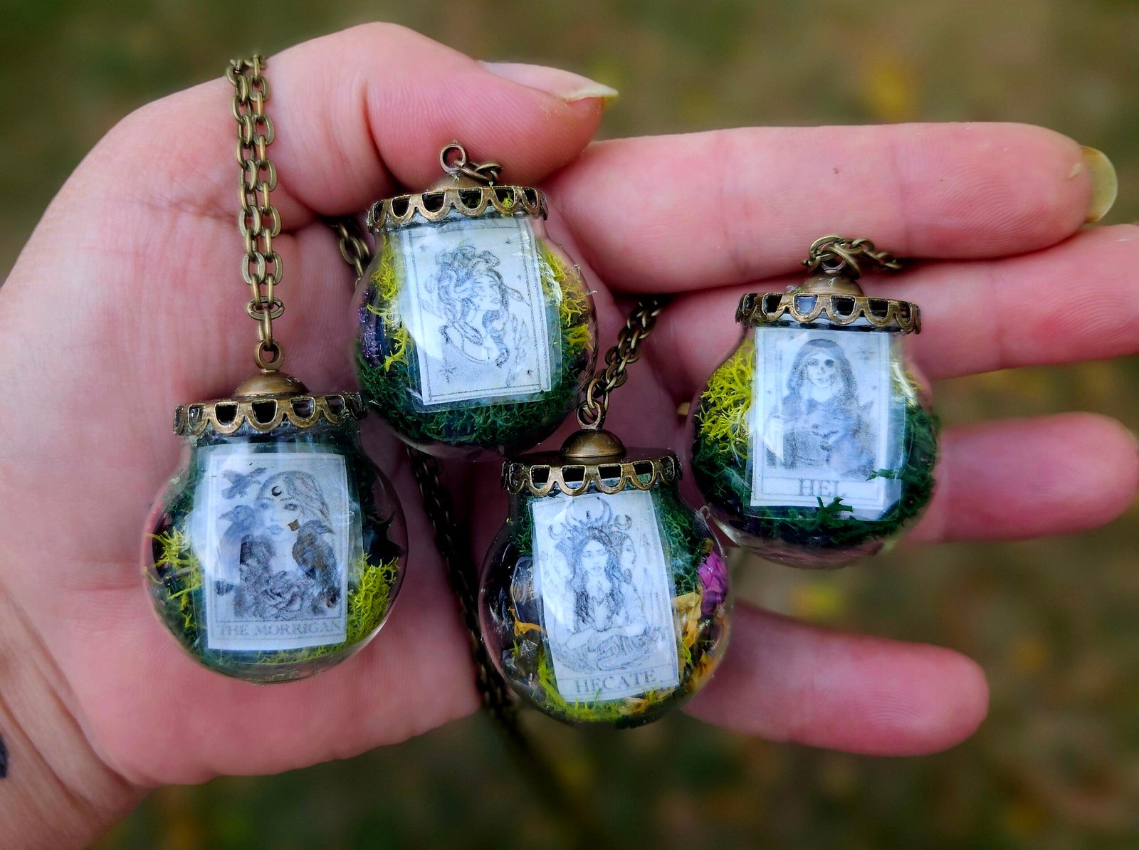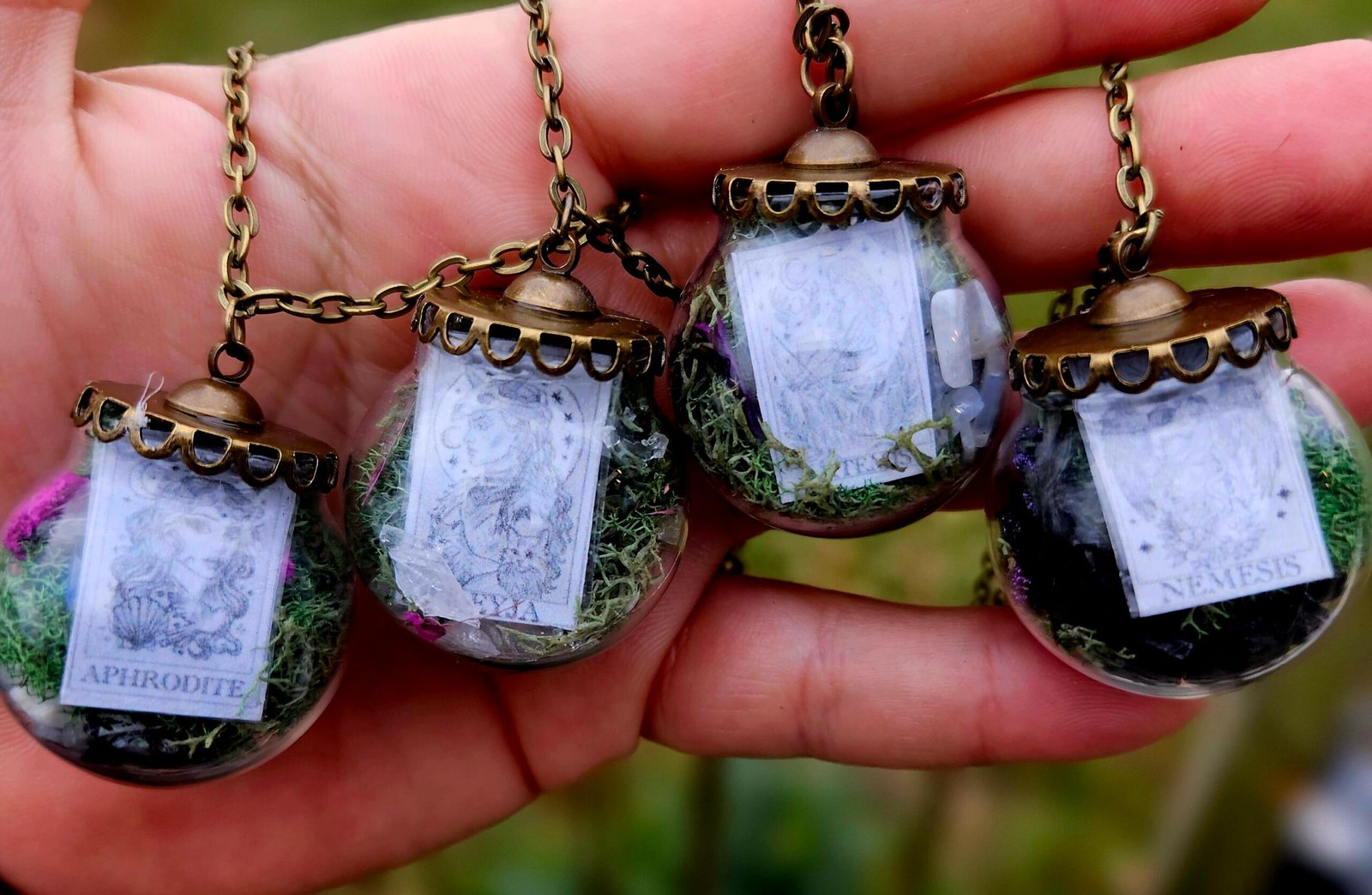 Each pendant is carefully crafted inside a glass globe and filled with gemstone chips, dried moss, and charms chosen to resonate with the unique energy of each goddess. The illustrations are drawn by me, making every piece a little wearable shrine filled with magic and intention.