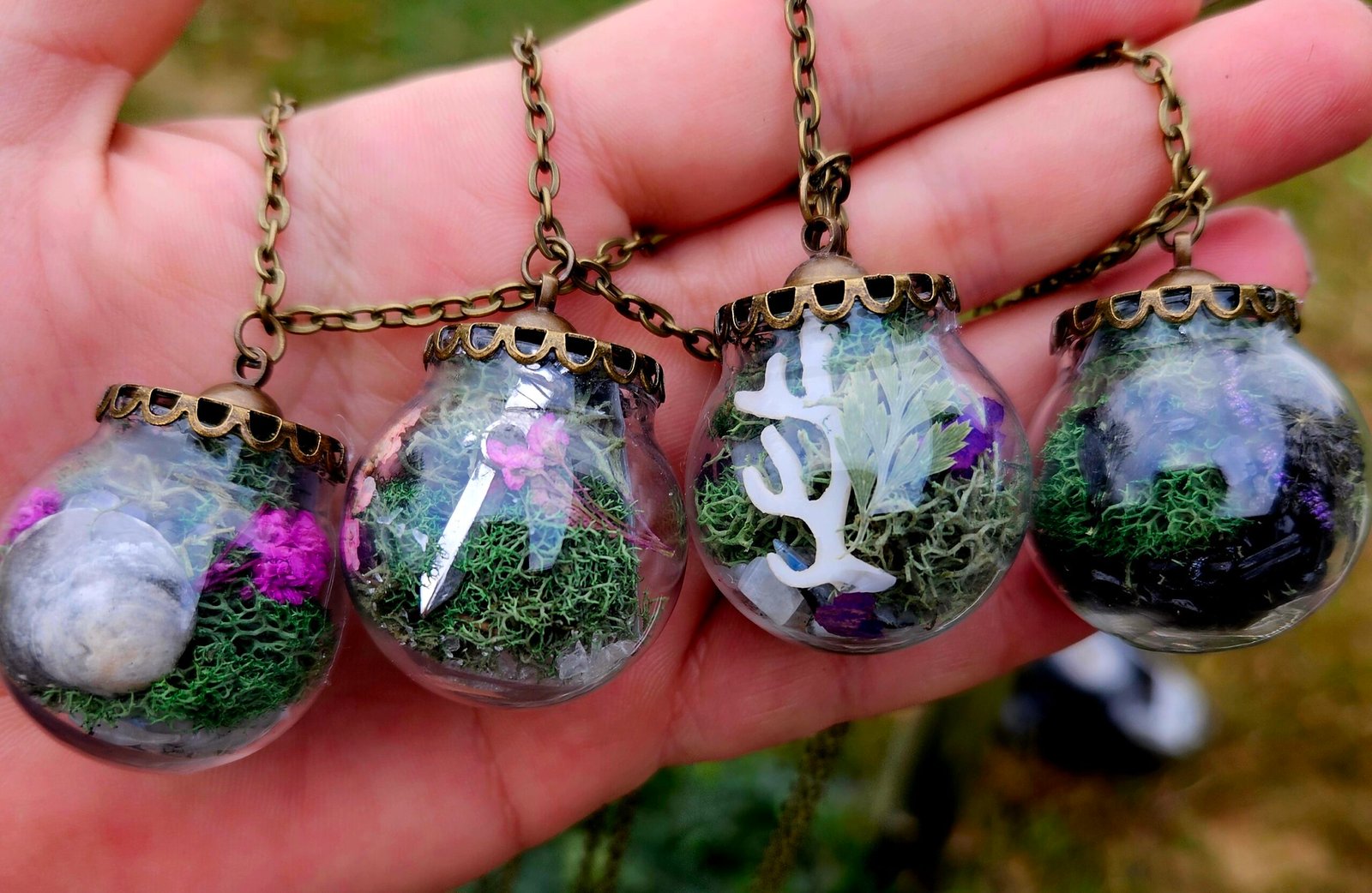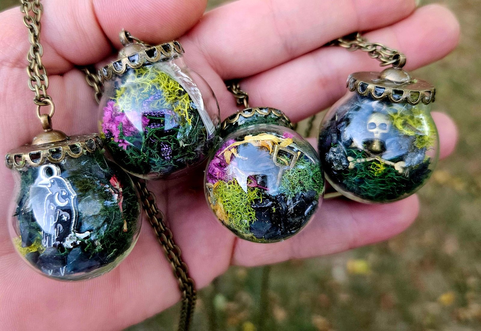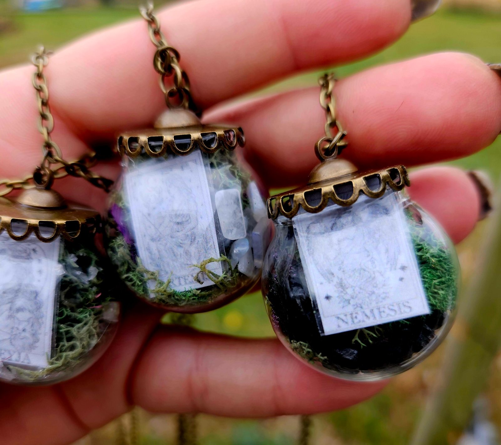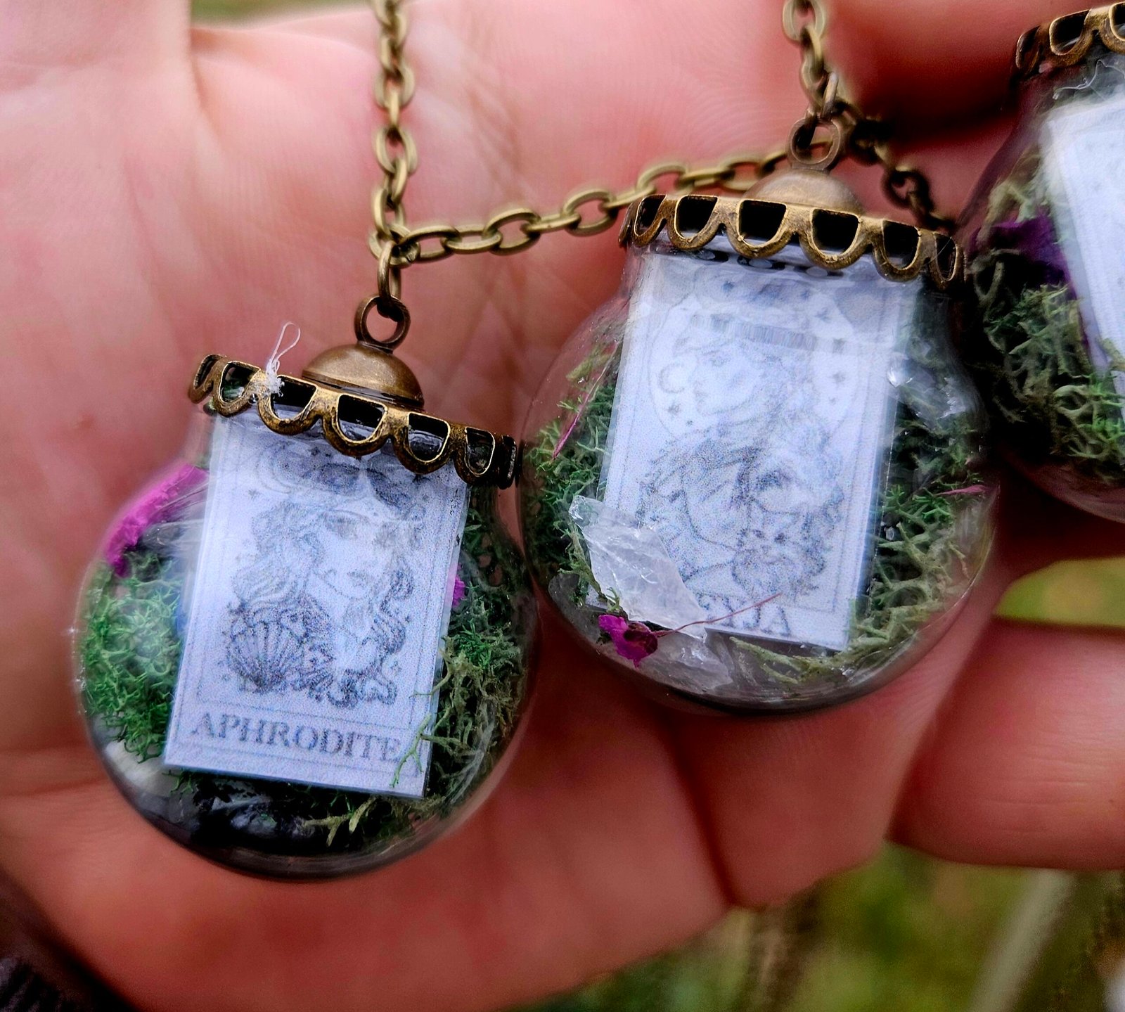 Each pendant is carefully crafted inside a glass globe and filled with gemstone chips, dried moss, and charms chosen to resonate with the unique energy of each goddess. The illustrations are drawn by me, making every piece a little wearable shrine filled with magic and intention.