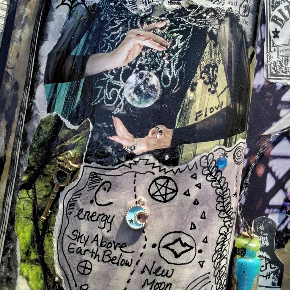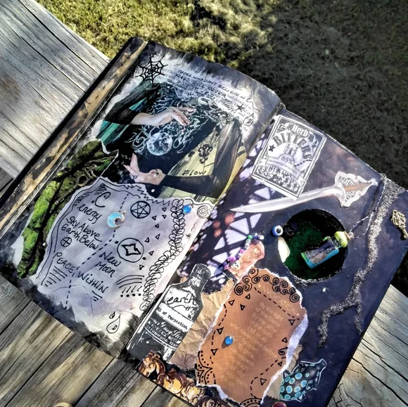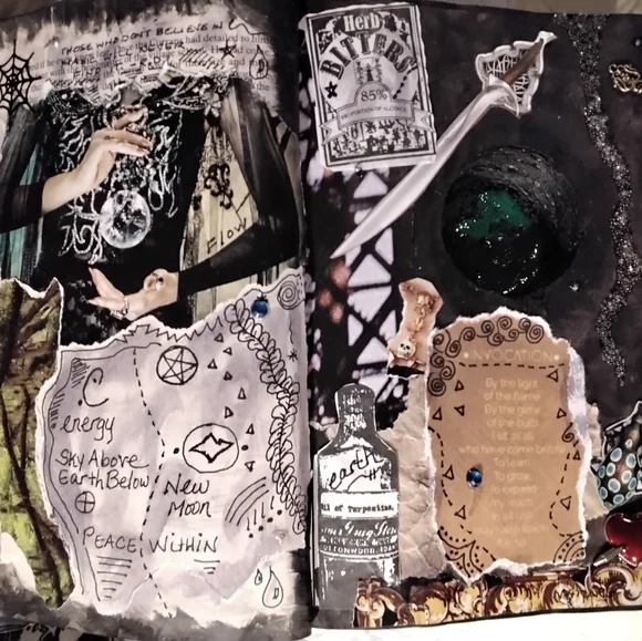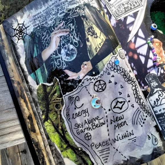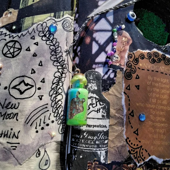 .Handmade witches grimoire..spell book prop..book is perm. sealed, water-resistant and can be wiped with a lightly damp cloth if needed..decor..book does not close..Protection spell bottle (wax sealed) is attached to the book spine, not attached to the actual page.. but could be removed if you so desired…Bathed in the last full moon! OOAK only one of its kind..original found object, mixed media art.. Please consider the time, effort and supplies used in artisan works. I would not ask you to perform your job at a discount, please do not ask me to do so…