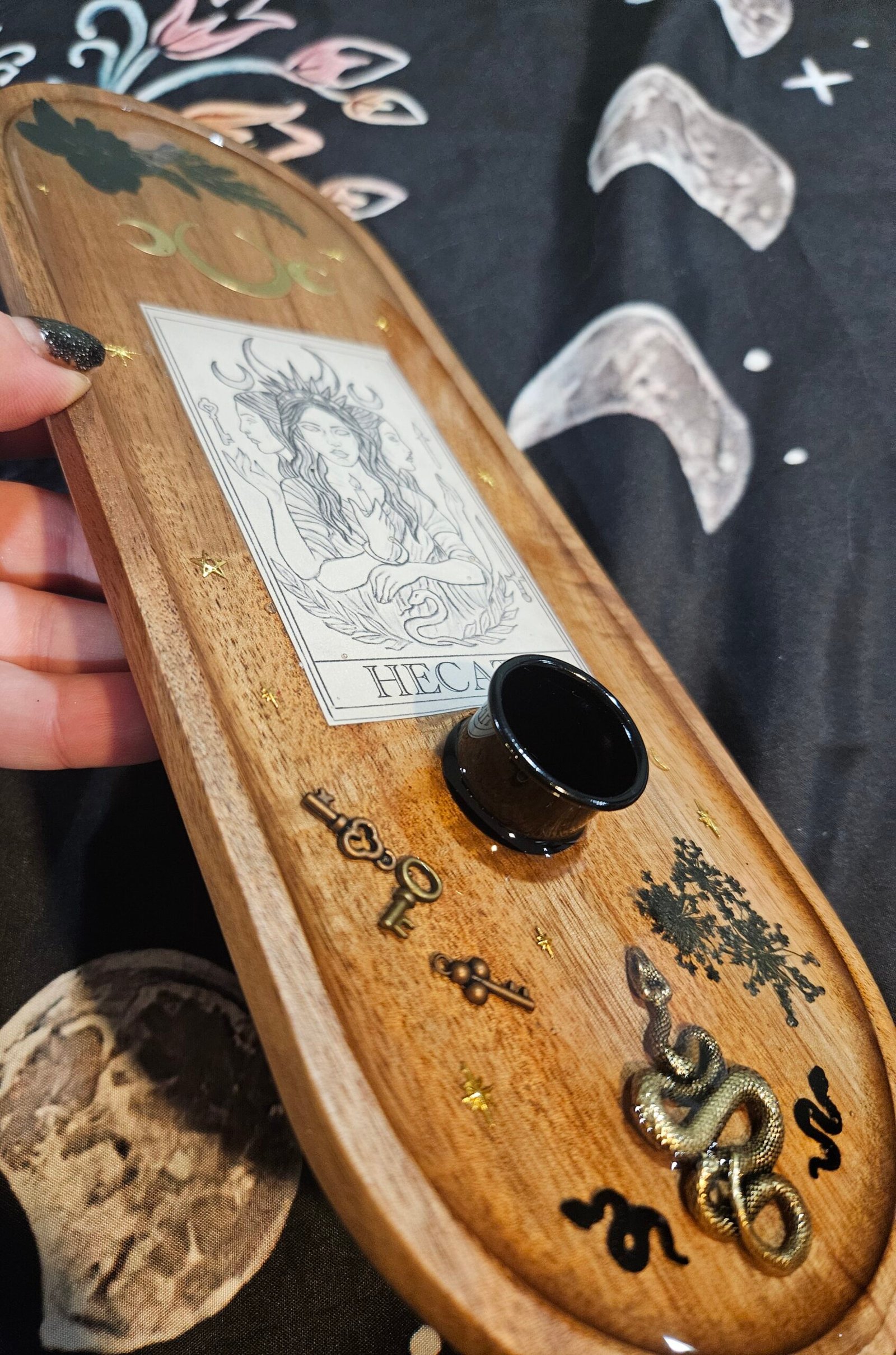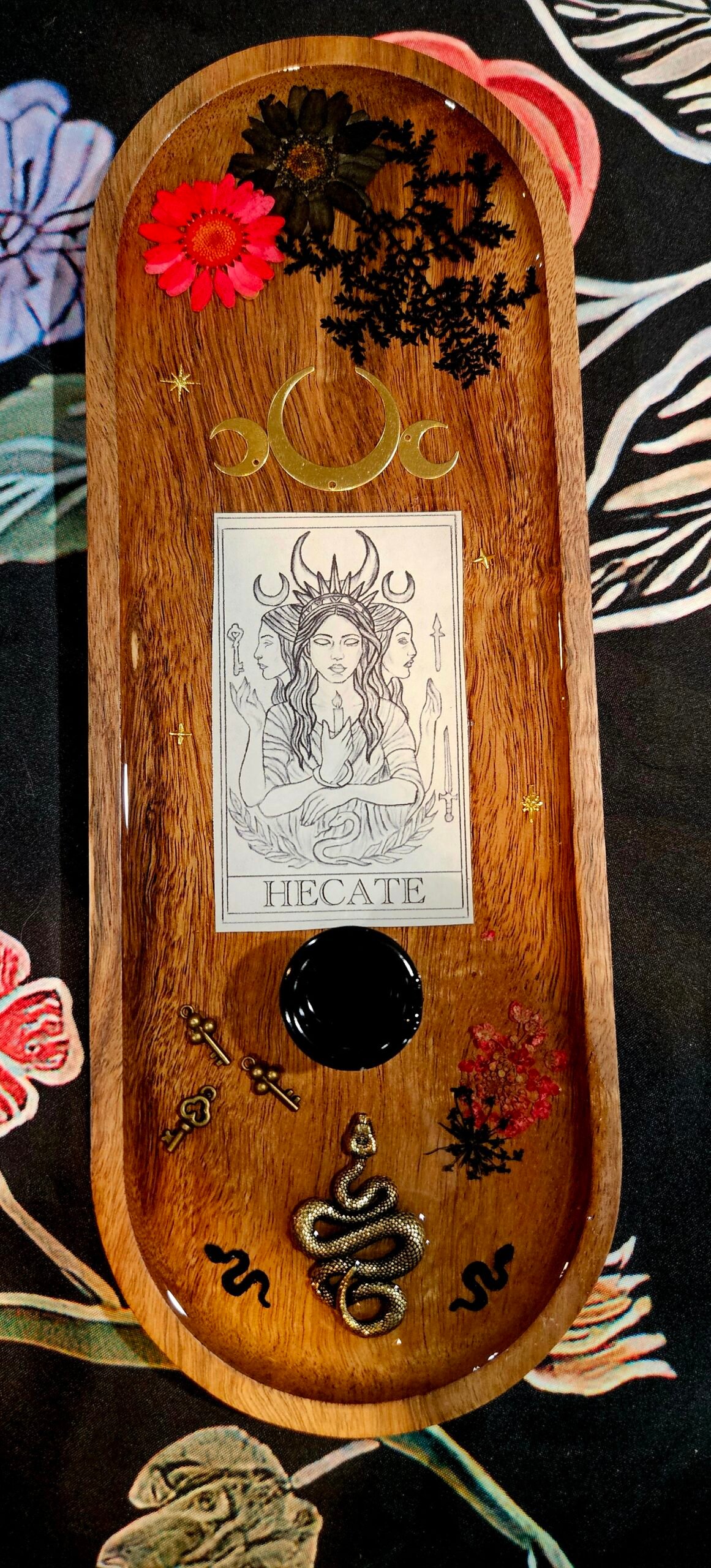 Honor Hecate, goddess of crossroads, magic, and the liminal spaces, with this larger-format offering tray designed for ritual, devotion, and altar work. This piece offers more room than the original design, making it ideal for candles, offerings, crystals, keys, and ritual tools.