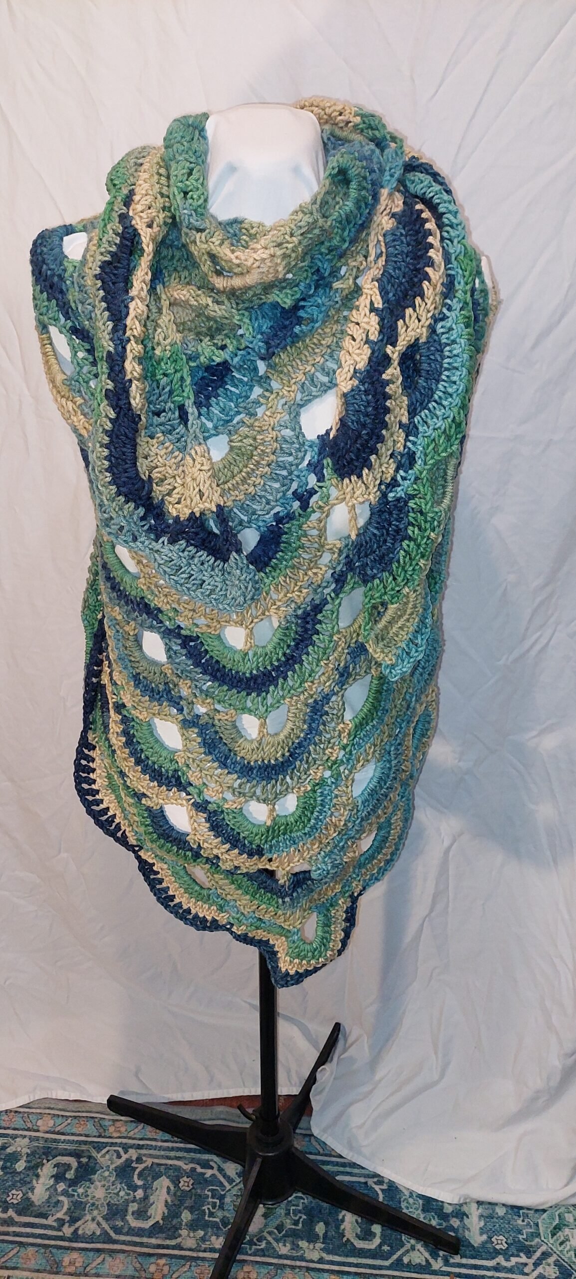 This boho crochet shawl is a soft, flowing accessory handcrafted with intricate stitches and earthy charm. Designed for effortless layering, it adds warmth, texture, and a free-spirited touch to any outfit, perfect for cozy evenings or festival-inspired style. It measures approx. 86″W x 46″L