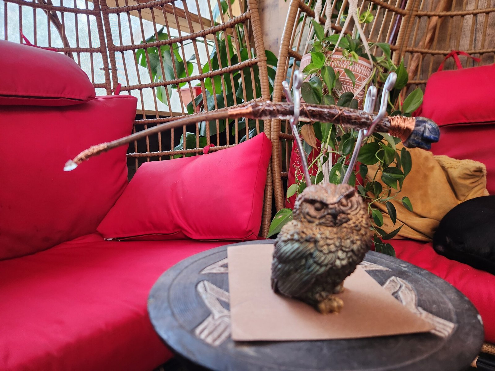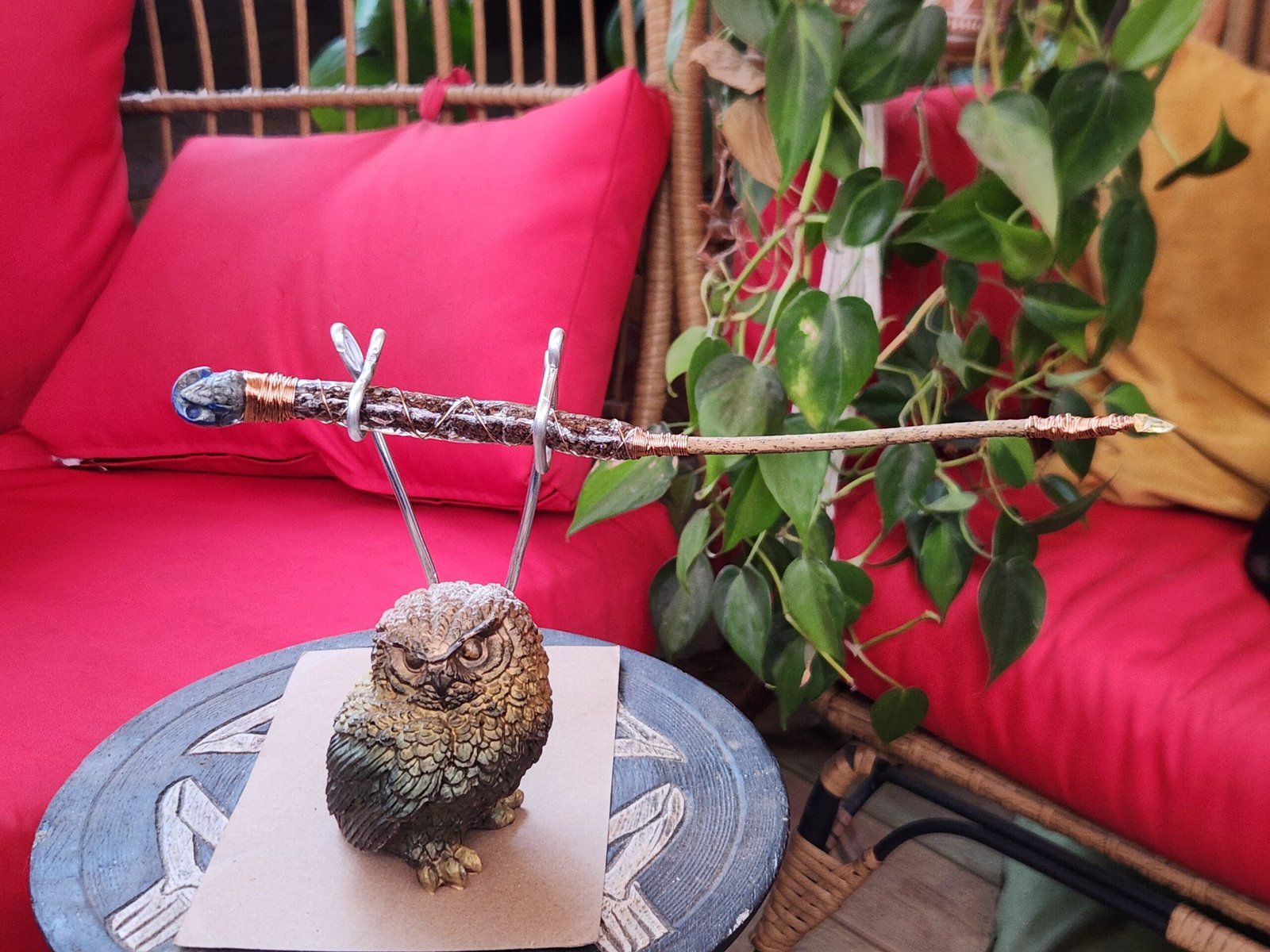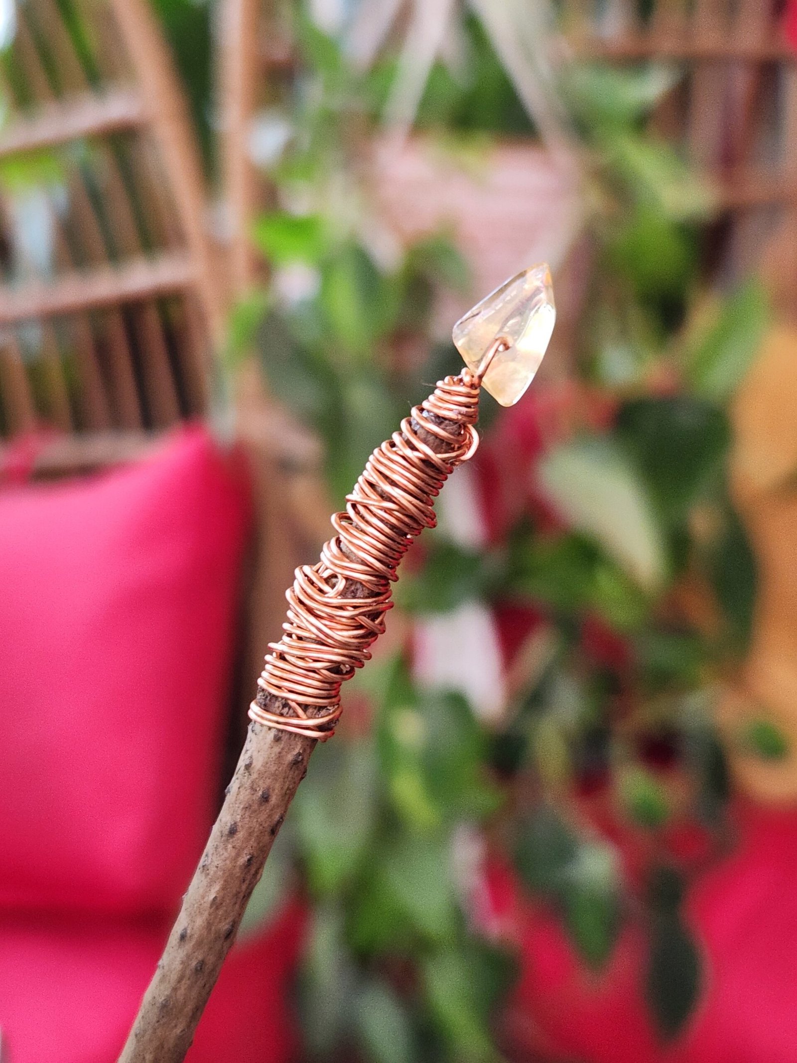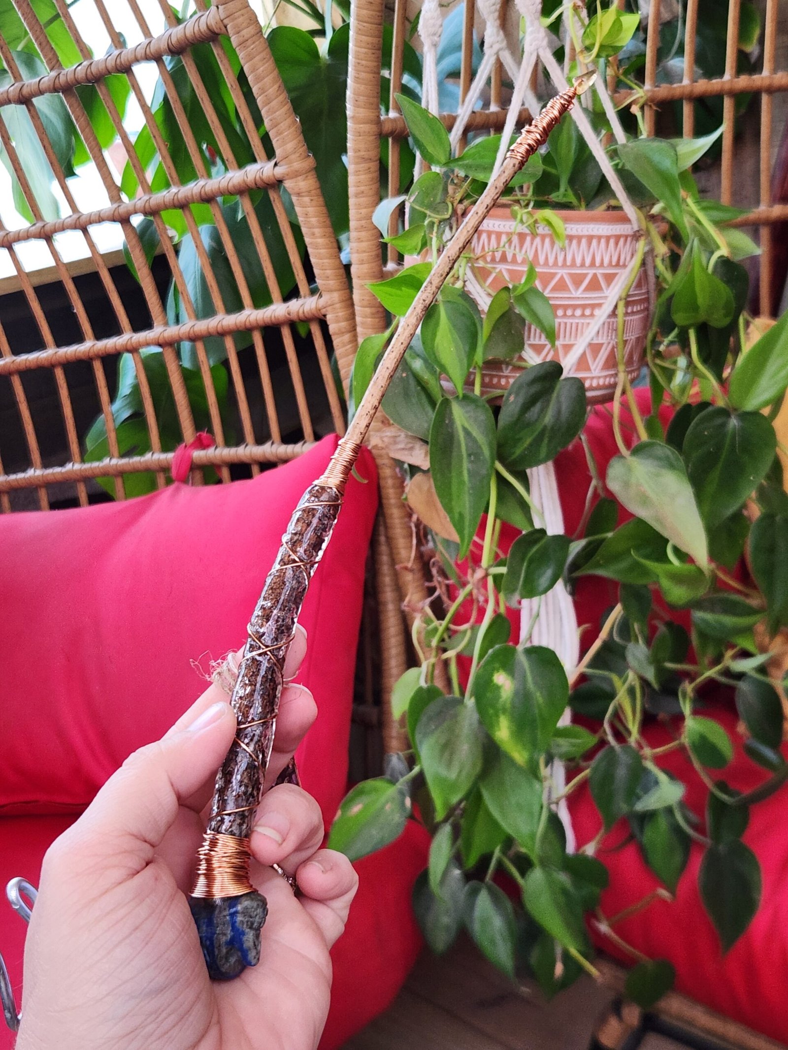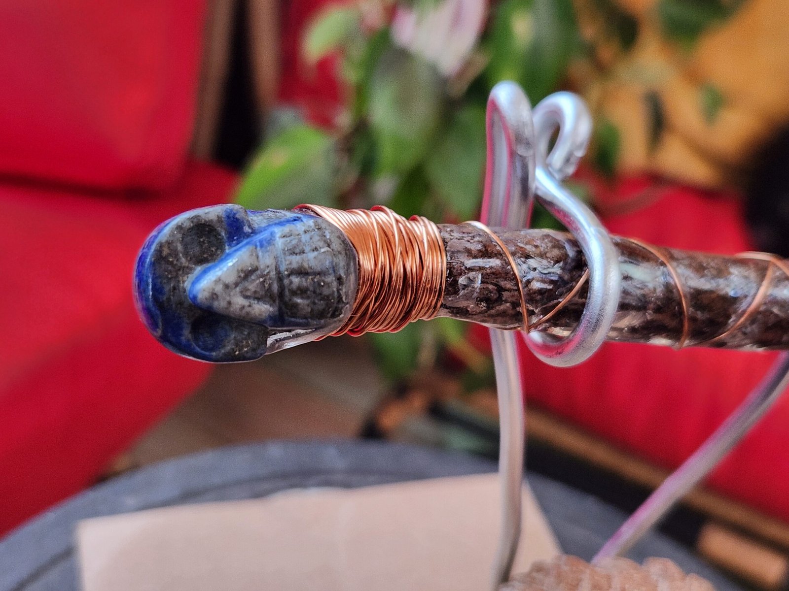 This pine wand is petite and bold at the same time. A Lapsis Lazuli carved skull sits on the hilt of the handle that has its natural bark, artistically encased with resin, to help it withstand time and use. Wrapped in copper wire from handle to tip helps move your energy upwards to the citrine tip.