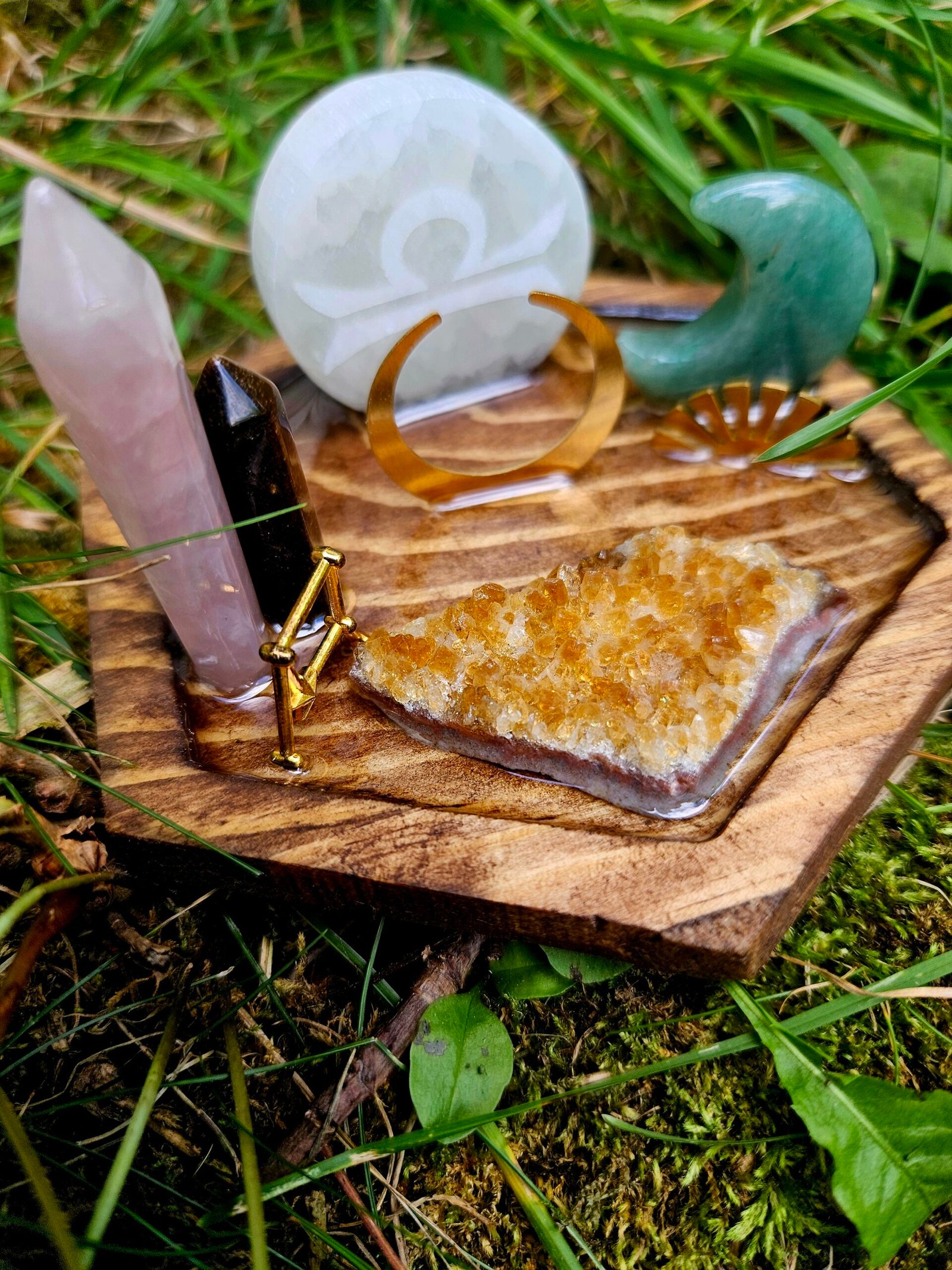 Set on a wooden tray with celestial accents