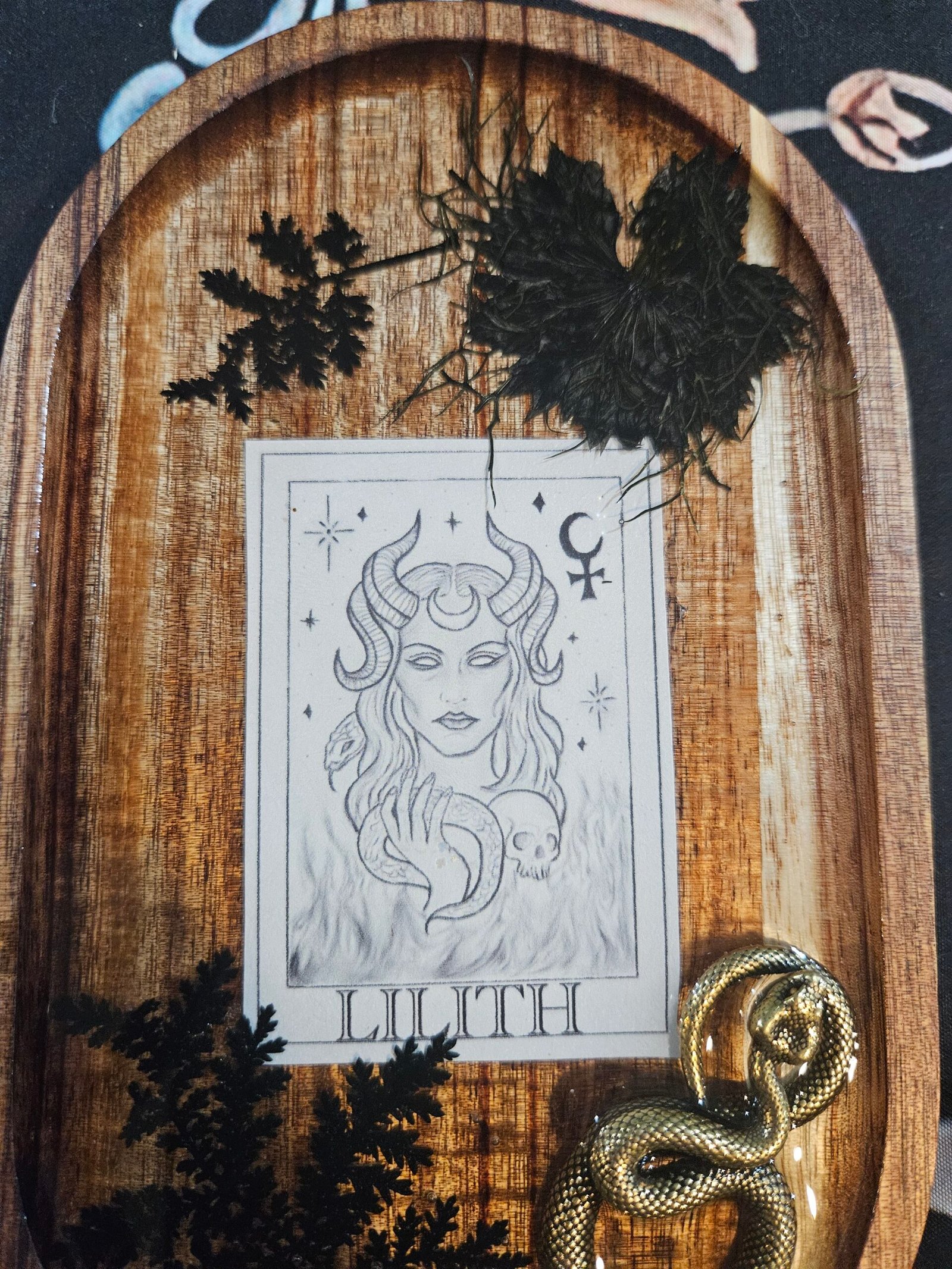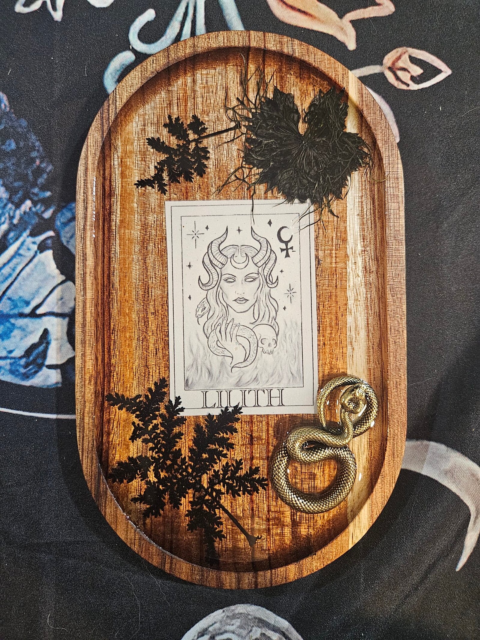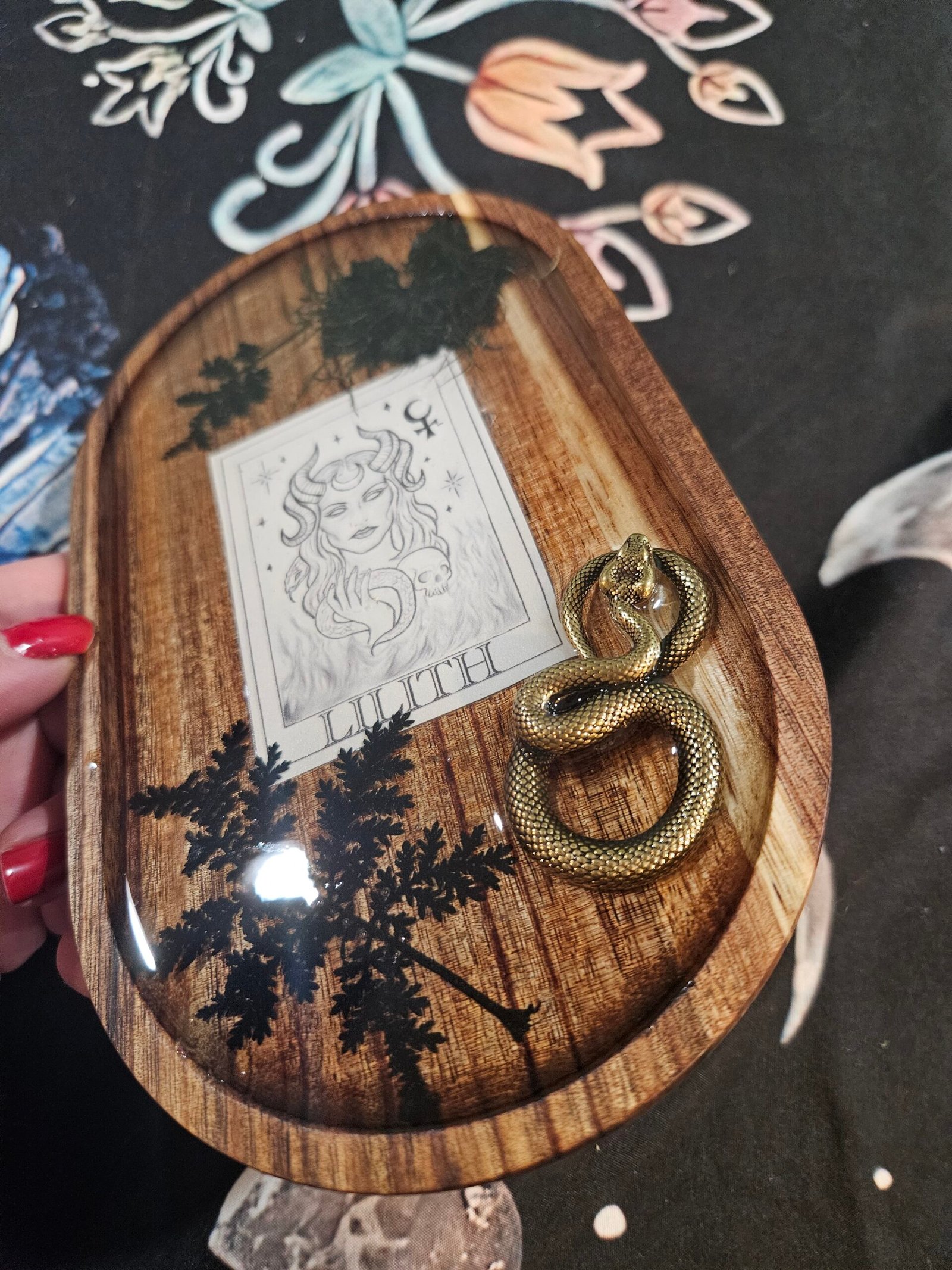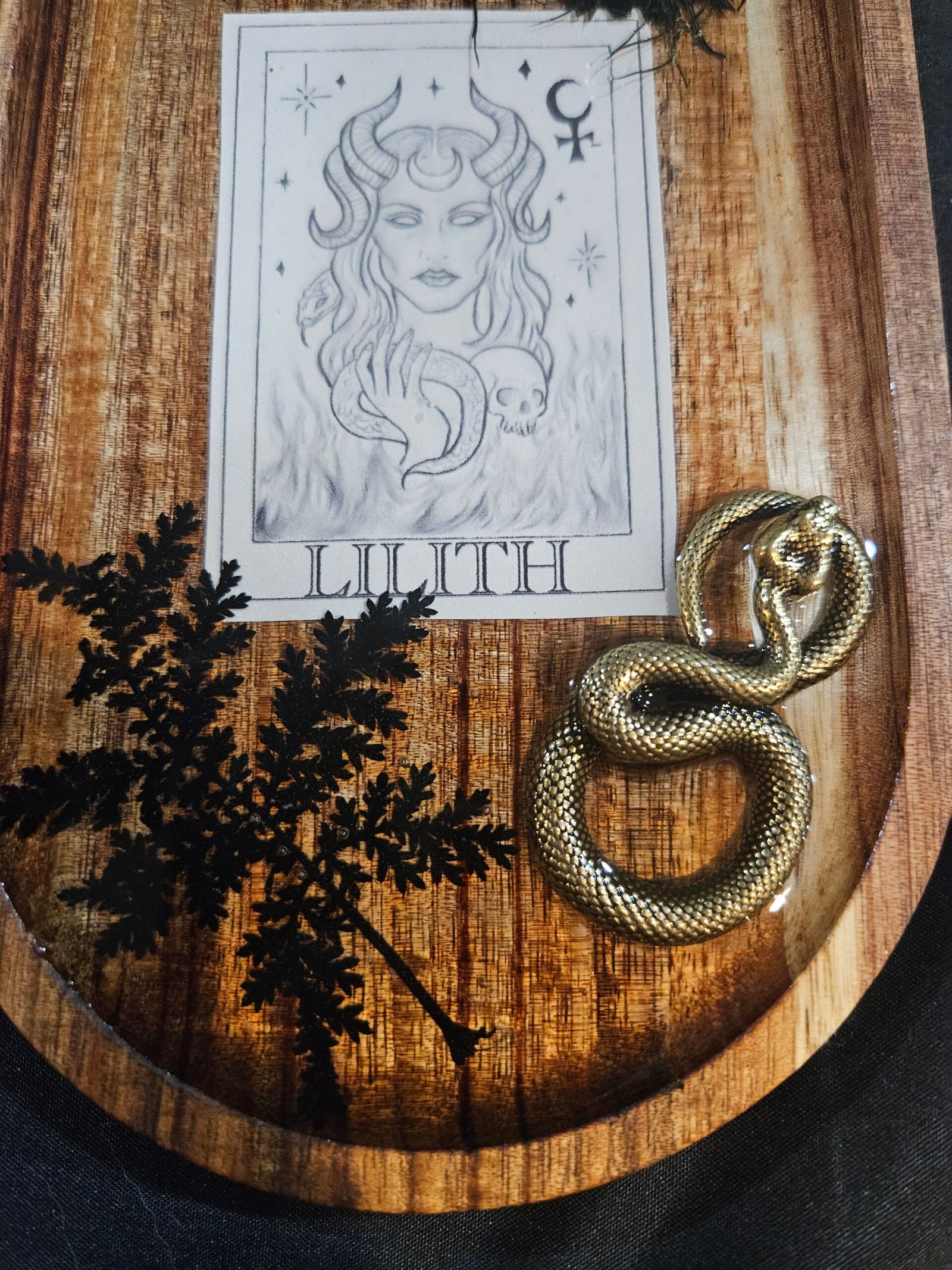 Each tray features my original hand-drawn illustration of Lilith, sealed beneath resin on a warm wooden base. Adorned with pressed black flowers, fern, and a golden serpent, this piece embodies Lilith’s duality—beauty and rebellion, creation and destruction.