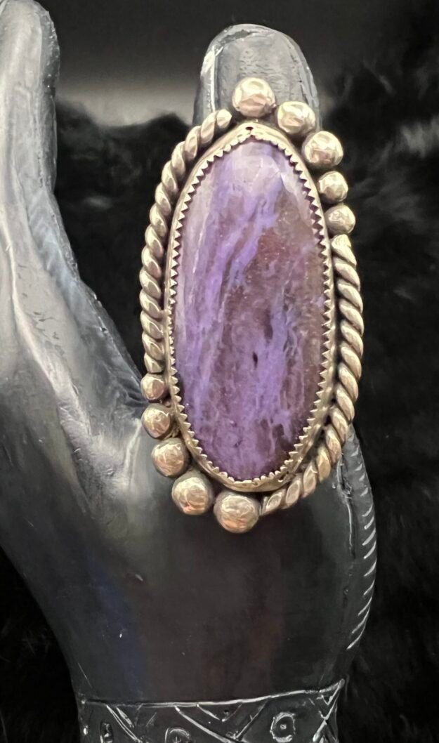 This Navajo-made, one of a kind Lilac Stone (Charoite) ring is one of my earlier pieces, this lovely ring holds a stunning large purple lilac stone cabochon. Charoite is a multidimensional stone that assists in connecting with spirit guides, deities, and entities. Two small flaws can be found on the bezel showing the stubbles of a budding silversmith. Bound by a serrated bezel, twisted wire and silver ball embellishments this ring is an enchanting piece regardless of its small imperfections. Size 9