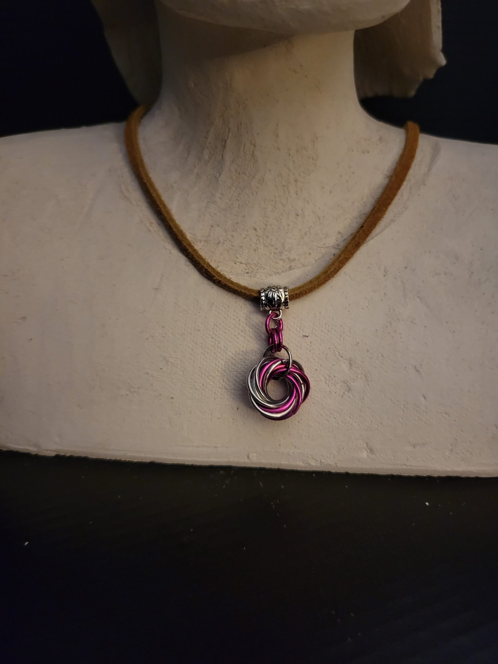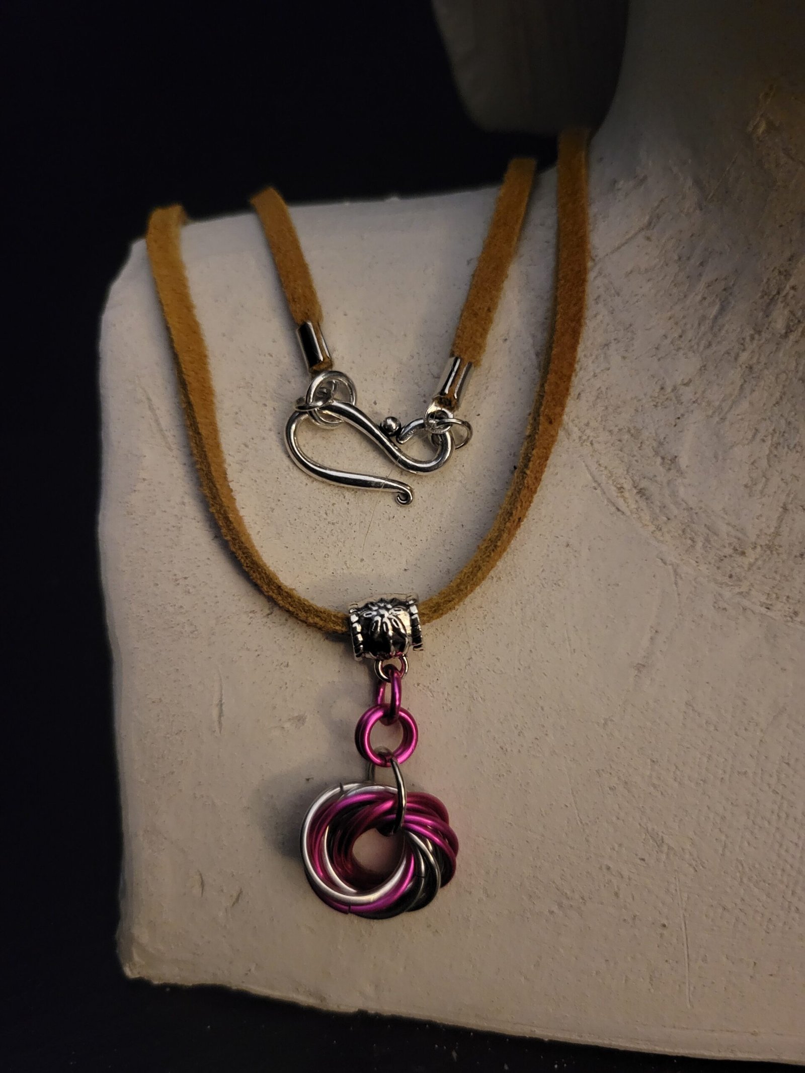 Made with anodized aluminum jump rings, suede leather cord, and stainless steel fastening.