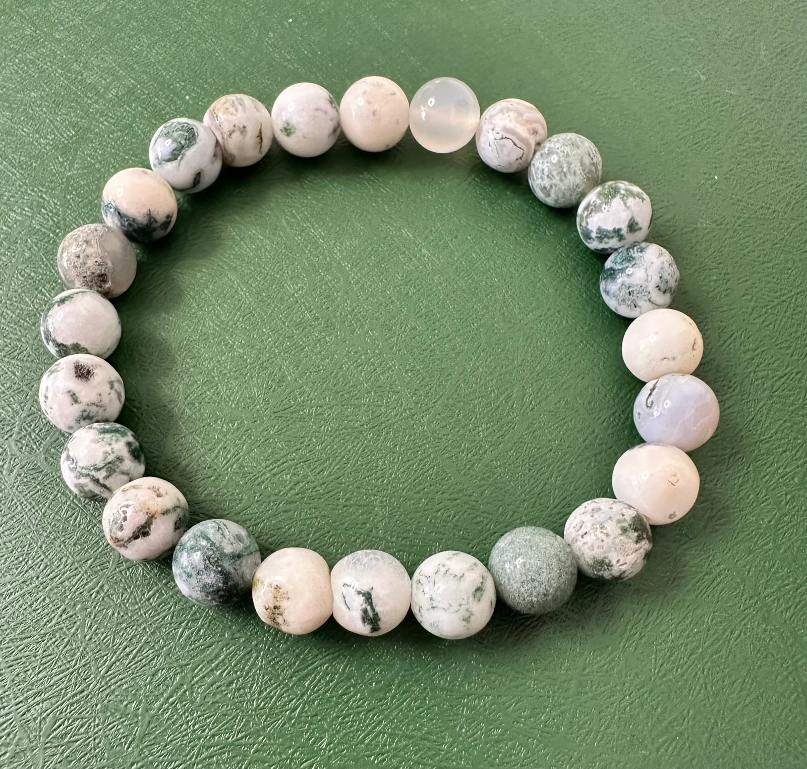 Grounded, earthy, and deeply connected to nature, this Moss Agate stretch bracelet features soft milky white stones accented with natural green, moss-like inclusions. Each bead displays unique internal patterning that resembles delicate vines, branches, or forest growth—no two bracelets are ever alike.