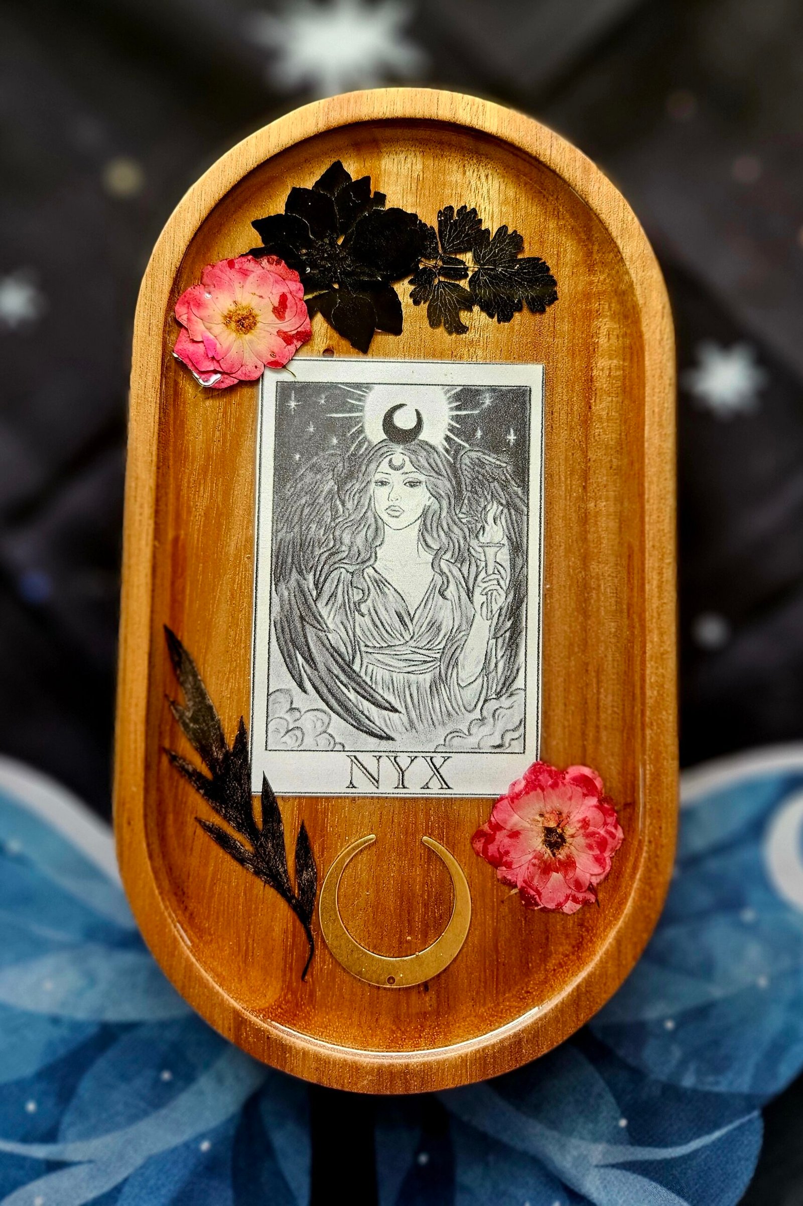 Elevate your sacred space with the ethereal allure of the Goddess Nyx Trinket Tray Altar Decor. Crafted with divine artistry, this tray becomes a celestial centerpiece, weaving mythology into everyday life. Each piece is uniquely adorned with dried pressed flowers, capturing nature’s fleeting beauty within a timeless design. Like a gentle embrace from the night sky, the tray offers a serene place to cradle your cherished trinkets or ritual tools. The intricate floral patterns conjure a sense of tranquility and connection to the earth, enhancing the ambiance of your altar. Discover a fusion of elegance and mythology with this divine trinket tray that seamlessly blends spiritual elements with striking design. Perfect for any altar, this piece invites the mystery and magic of the goddess . This Nyx tray is 7.5 inches long and 4.5 inches wide. Everything is held in place with a layer of resin.