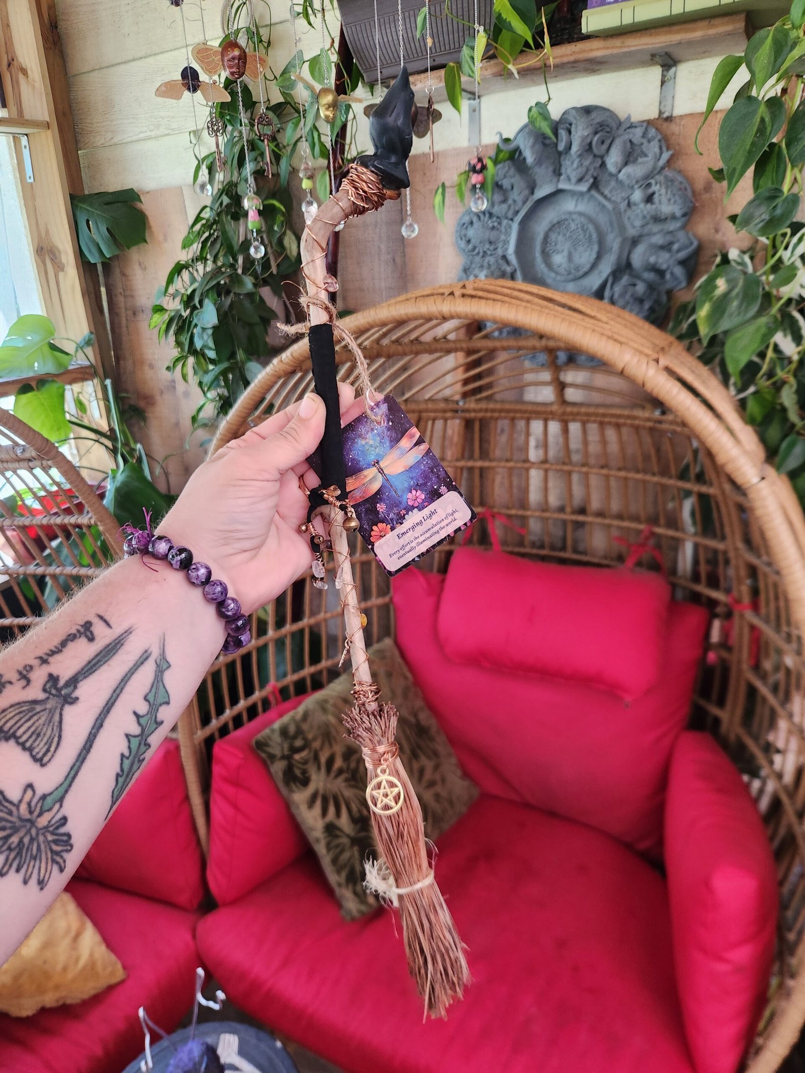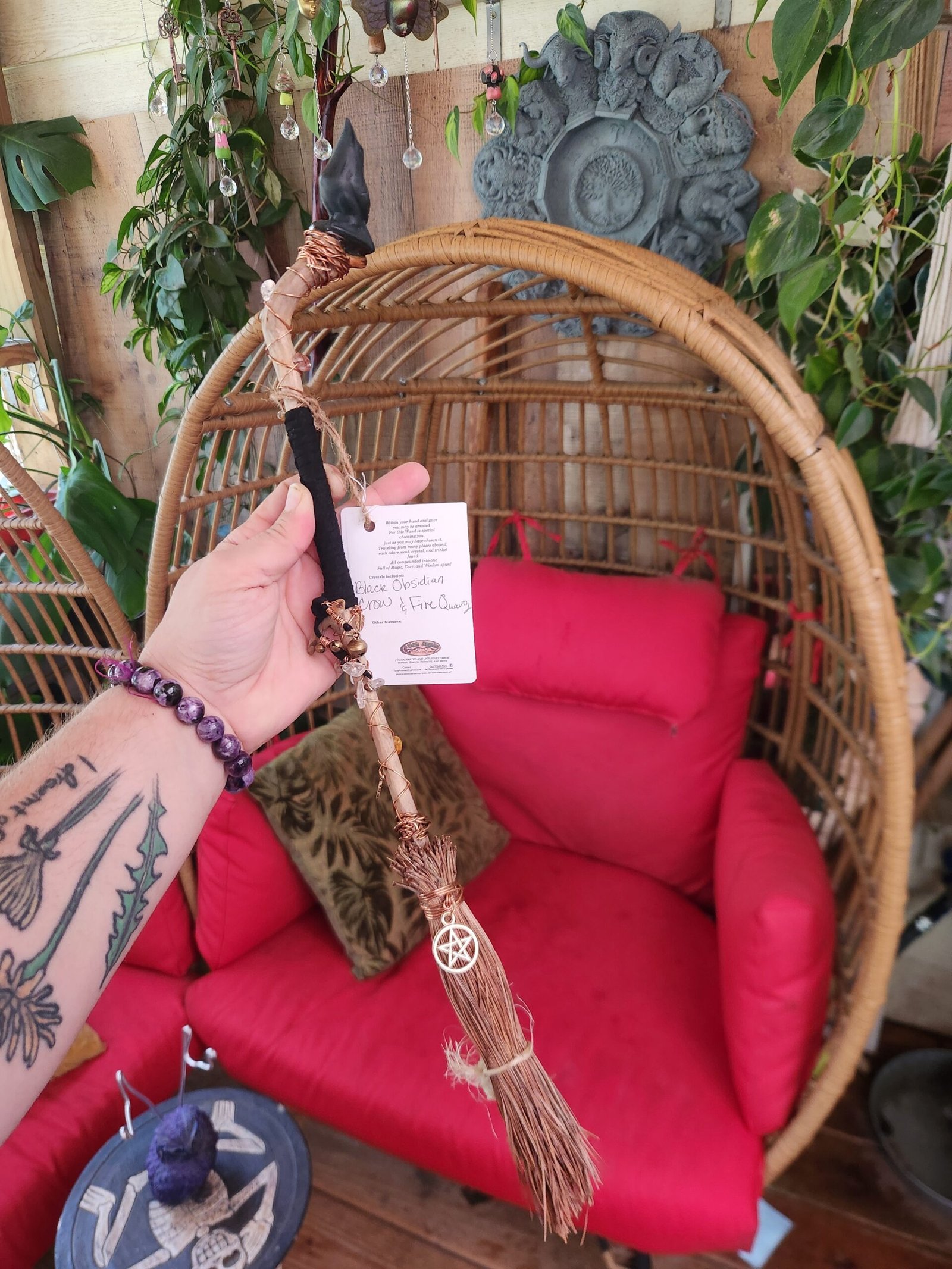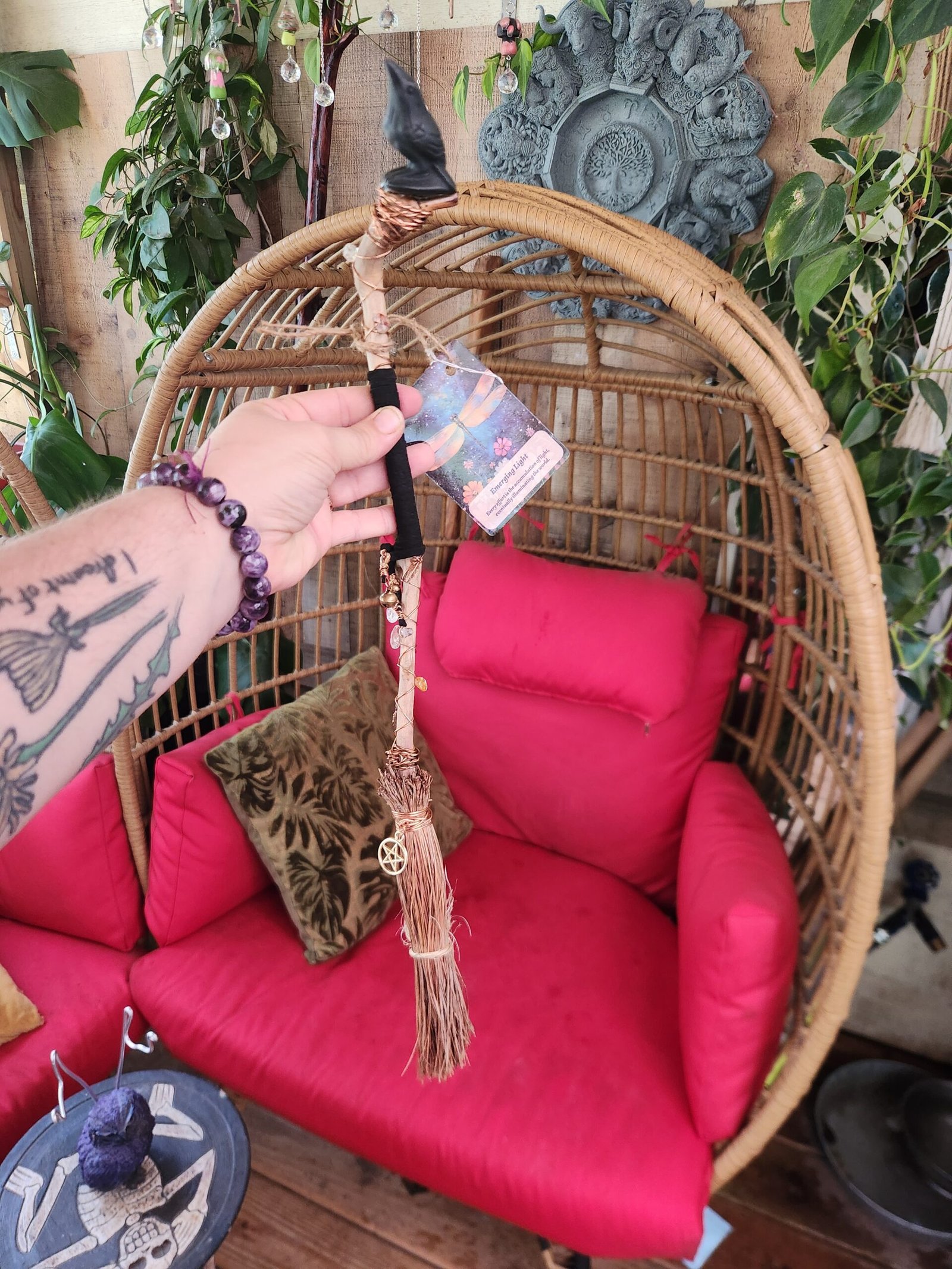 This Black Obsidian crystal raven carving sits on top of this beautiful mini alter broom. Accented with copper wiring and Fire quartz beading. Even the charms add delight with a mini brass bell to chime as you sweep. Freshening up your space. The bristles on this broom were harvested from a tree downed by lighting. When you use this well-made besom, you can feel how special it is.