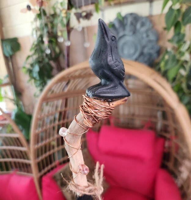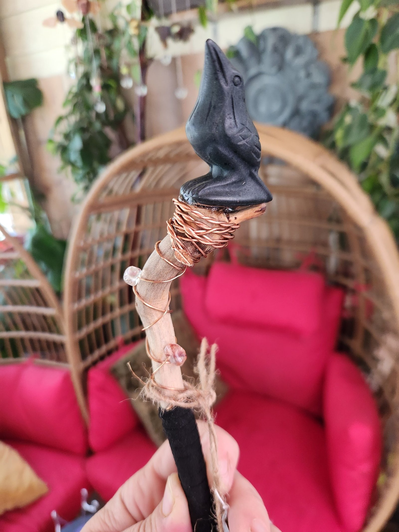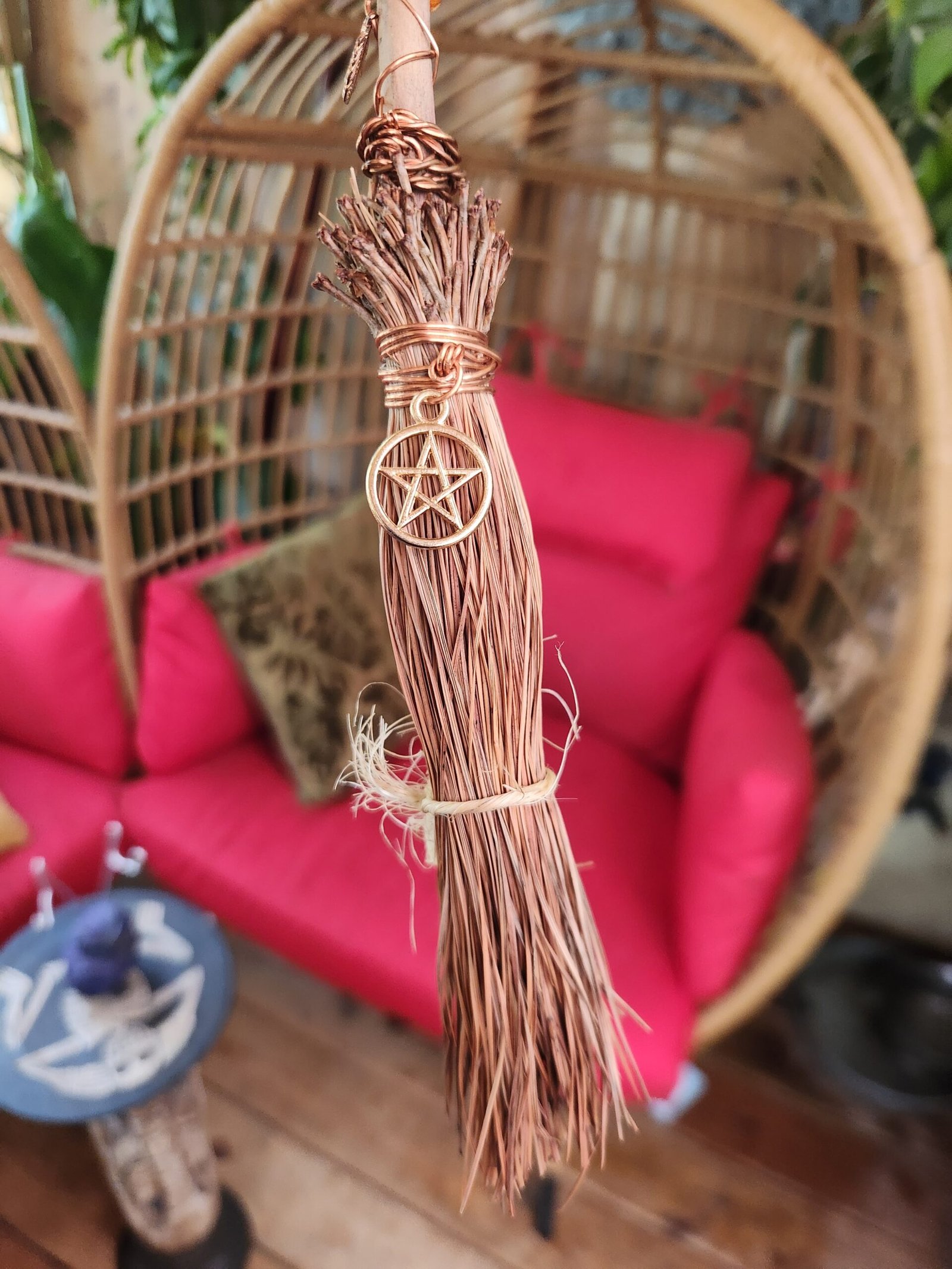 This Black Obsidian crystal raven carving sits on top of this beautiful mini alter broom. Accented with copper wiring and Fire quartz beading. Even the charms add delight with a mini brass bell to chime as you sweep. Freshening up your space. The bristles on this broom were harvested from a tree downed by lighting. When you use this well-made besom, you can feel how special it is.