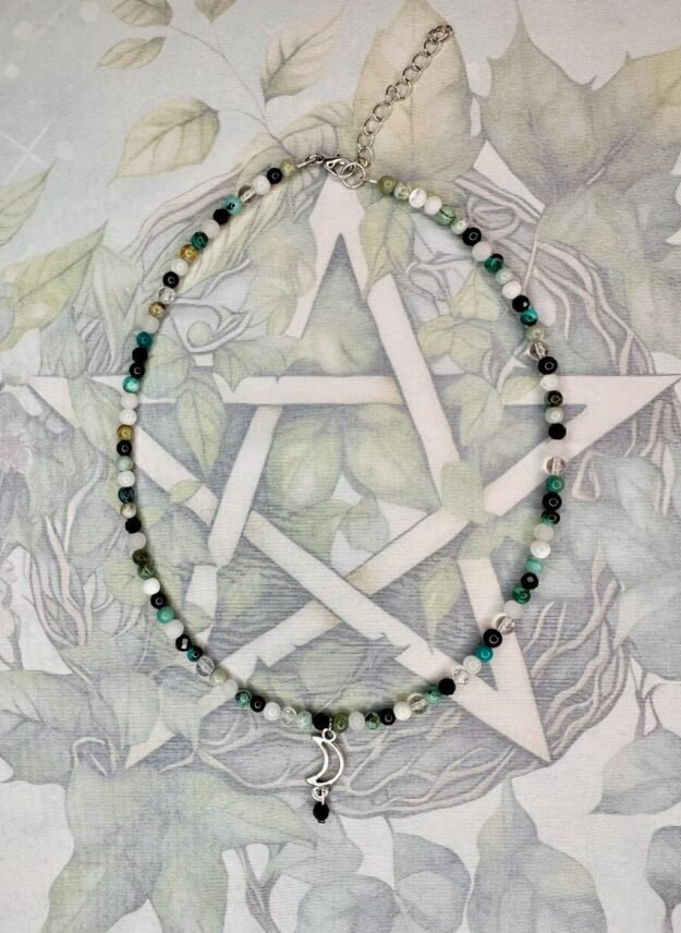 One of a kind 4mm Choker length beaded necklace with crescent moon charm and chrysocolla, black onyx, mother of pearl, clear quartz, matte white jade