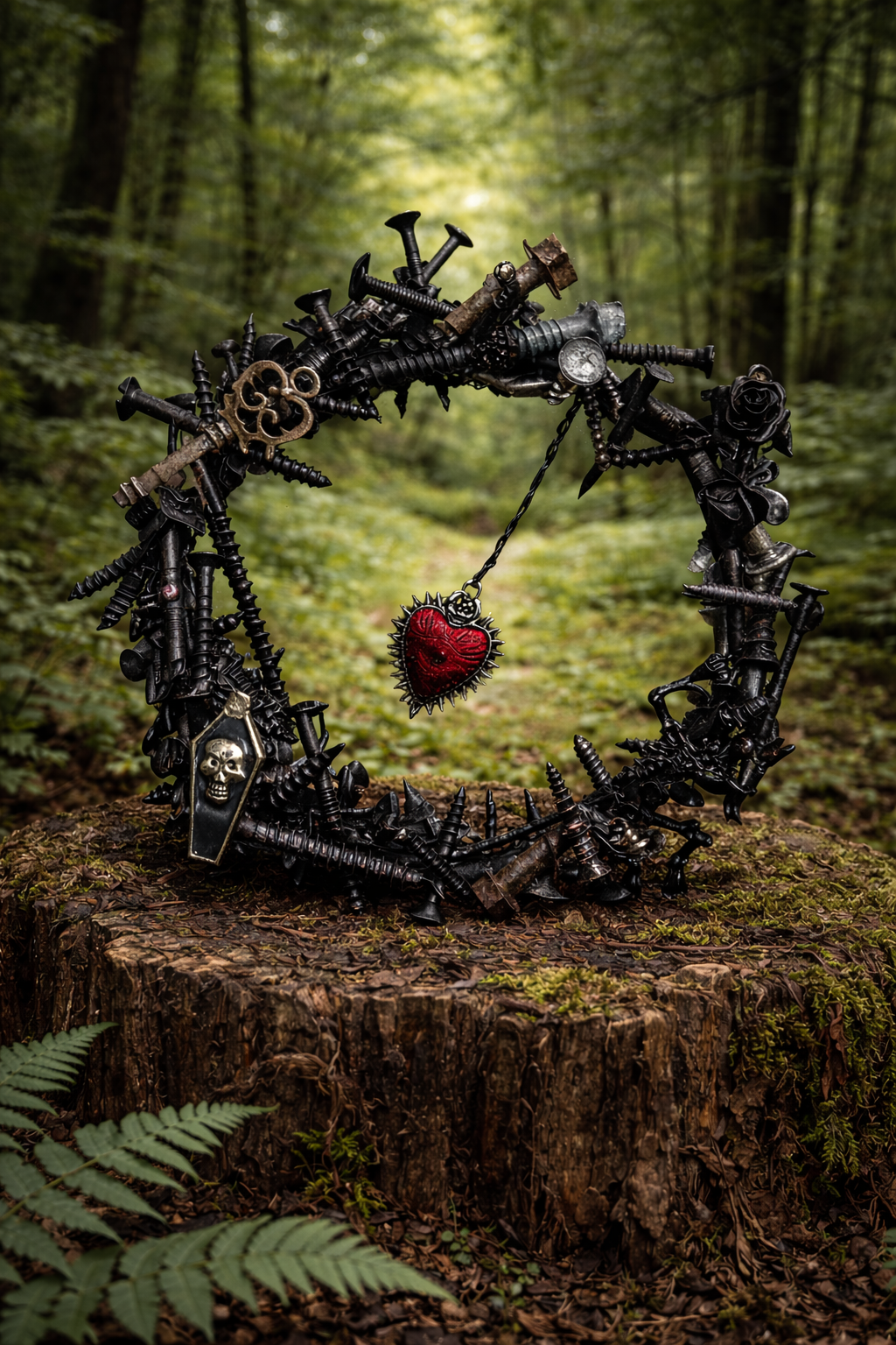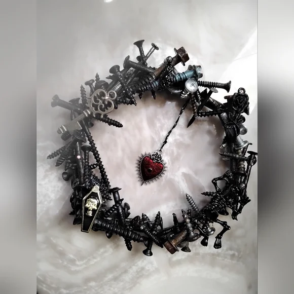 One of a kind, hanging decor, handmade ‘wreath’…this is a solid piece! Can be hung by the metal ring on the back, or on a nail -will fit in perfectly! Painted half black, other side was left as is for contrast.. OOAK.. Sealed with a waterproof coating, may be cleaned using a lightly damp cloth if needed..