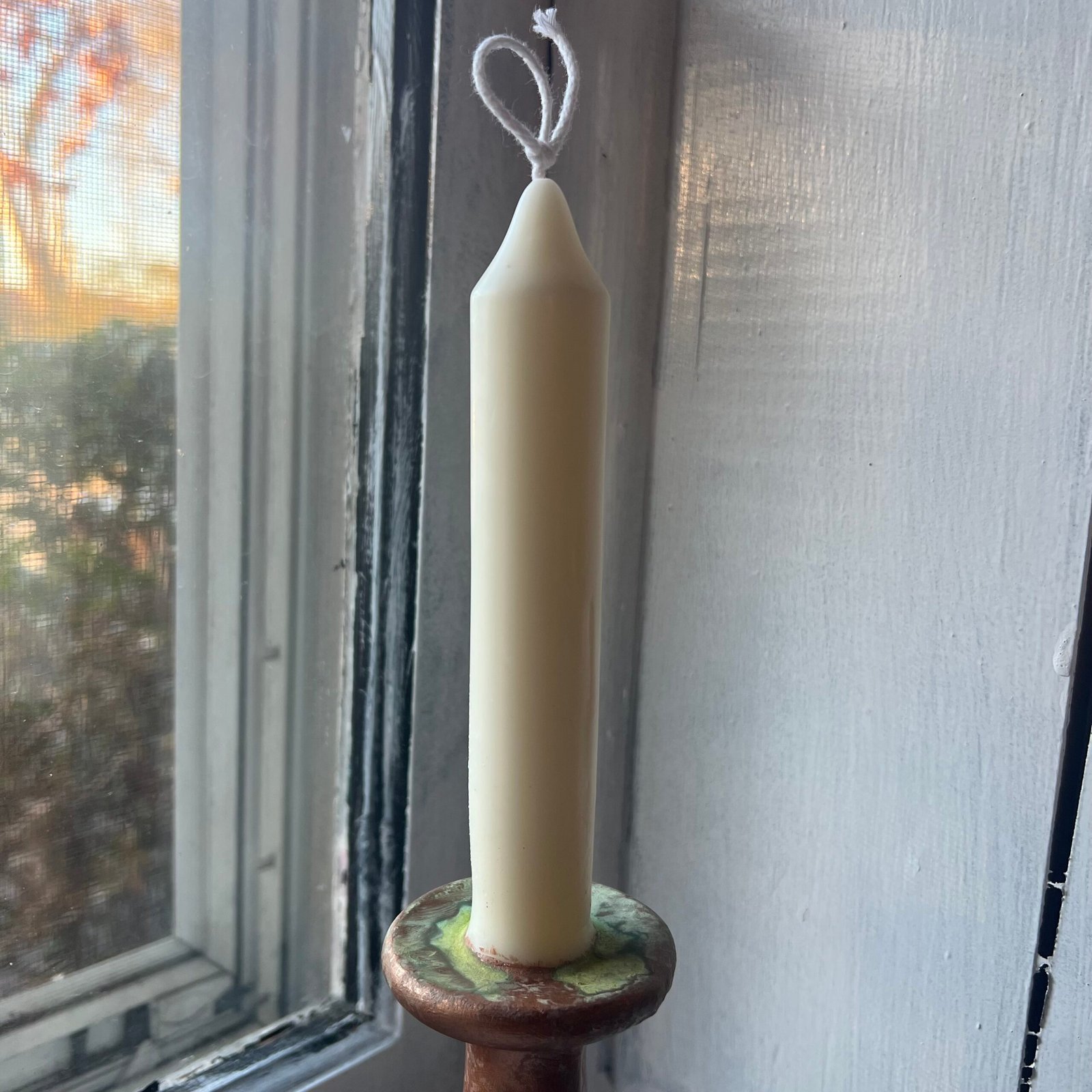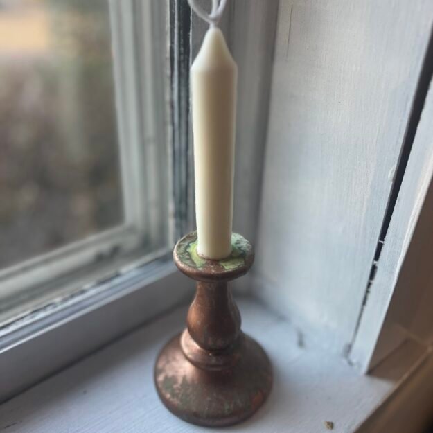 Created top to bottom with 58/42 ParaSoy Wax, this taper candle stepped out of the shadows to decorate your home or altar. The bottom “handle” of the candle is gilded to mimic the patina of old copper.