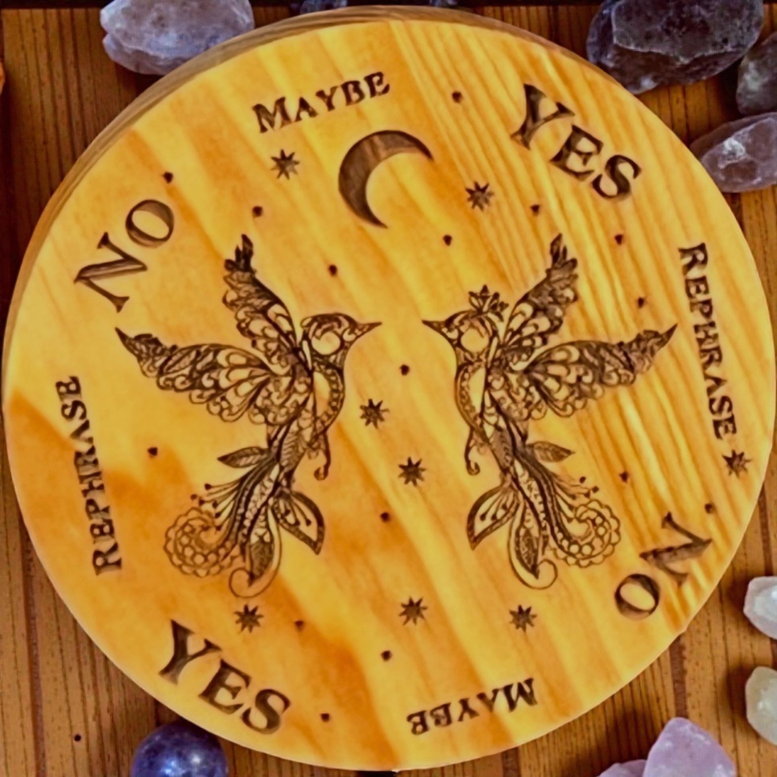 The use of Pendulum Boards in divination is for very specific, short, one answer questions. Â You can use your own pendulum or purchase one of my handmade pendulums to go with it.