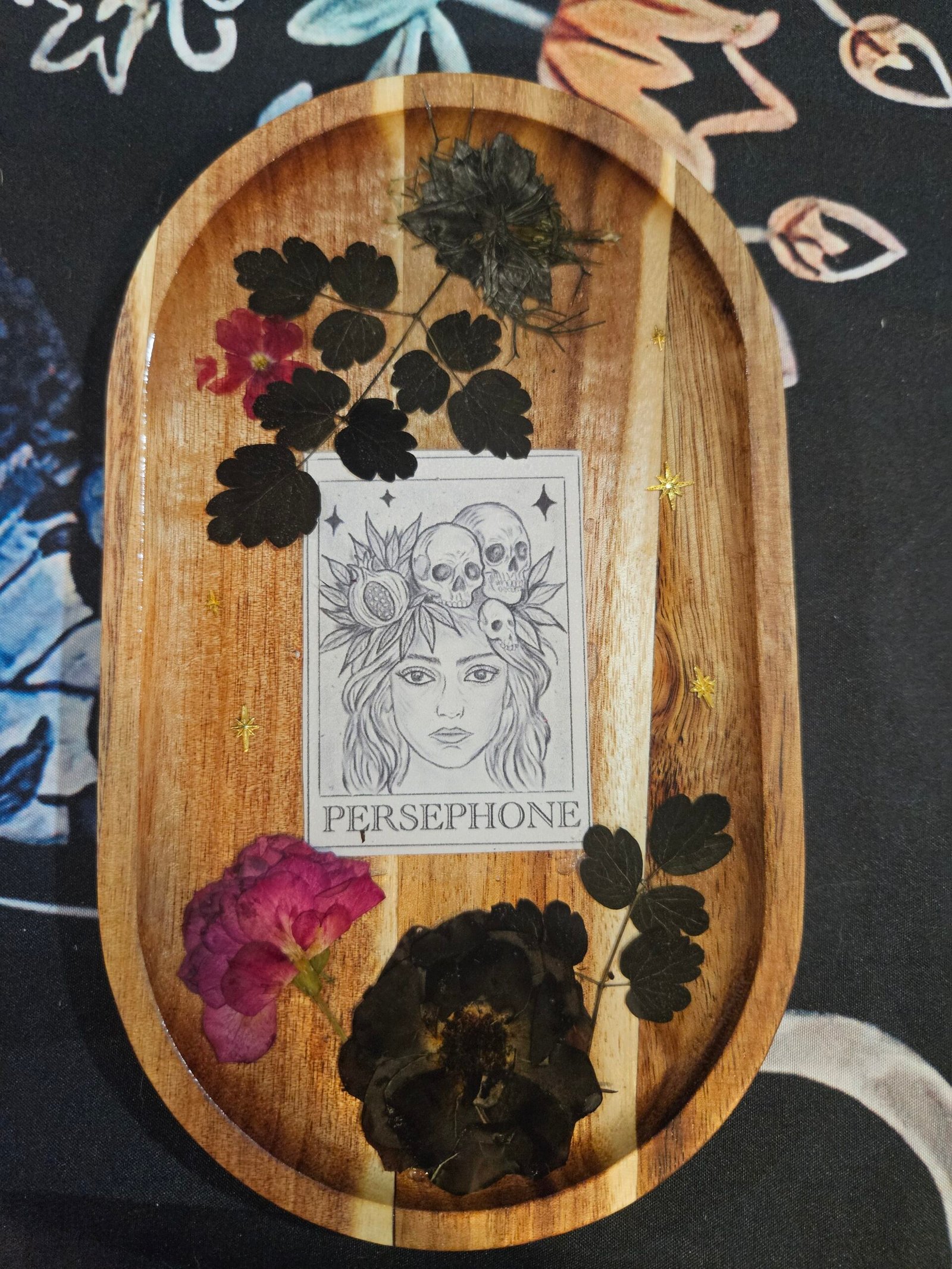 It’s more than just a trinket tray—it’s a gateway to serenity The Persephone trinket tray with dried flowers brings an artful touch of nature to your altar decor, reminiscent of a sunlit garden captured in still life. Each tray is a delicate balance of elegance and enchantment, perfect for those who appreciate the beauty of natural elements. With its intricate design, this trinket tray provides a stunning backdrop for your cherished items, making your altar a place of reverence and tranquility. The carefully selected dried flowers embedded within the tray evoke the myth of Persephone, blending the mystical with the tangible. Transform your space with this unique piece thataptured in a timeless display. Let this altar decor be the heart of your sacred space, where practicality meets poetic beauty.
