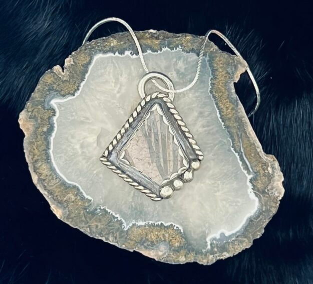 Mimbres (1100-1140ad) pottery is known for its black and white design. This pottery shard is hugged by a fine silver scalloped bezel and decorated with twisted wire and silver beading making for a truly distinctive piece. This particular piece was found in New Mexico on my dear friend’s private property and made into a beautiful pendant. Pendant comes with an 8″ sterling silver necklace to complete the look.