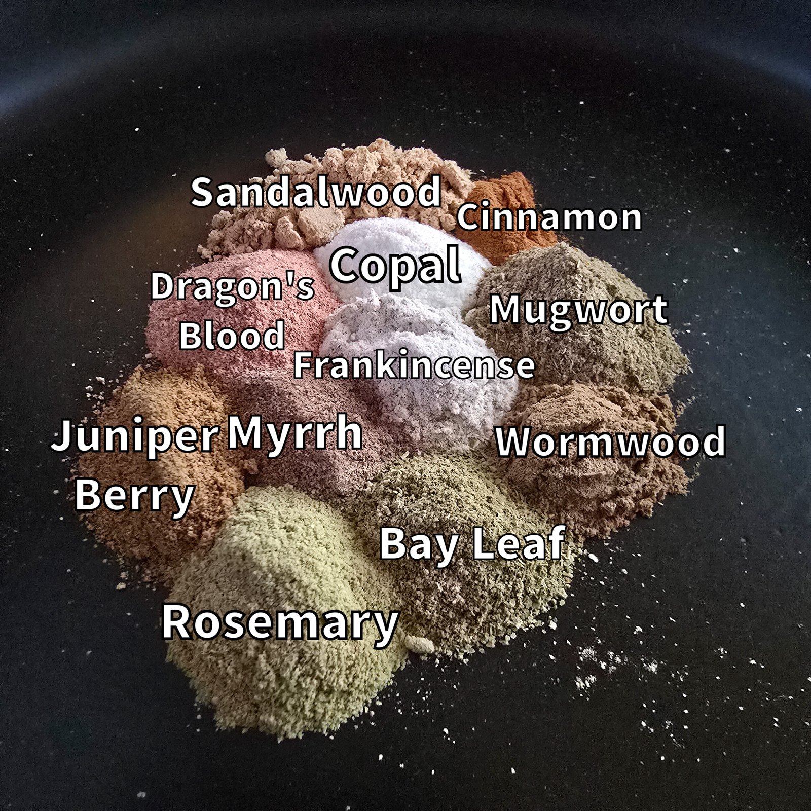 Bright resins open the blend with clarity and reverence, lifting prayers and offerings while illuminating the ritual space. Deeper resins and woods follow, anchoring the smoke with warmth, protection, and underworld depth. Traditional herbs associated with vision, divination, and hedge crossing gently open perception, while protective botanicals help maintain clear boundaries during spirit work.