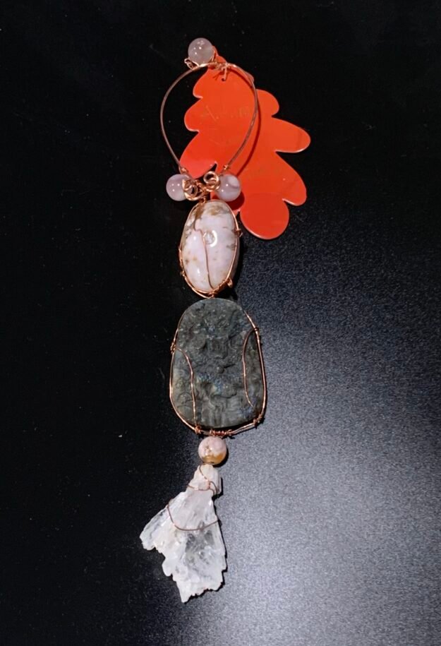 Hiss is part of the Stones and Bones collection, intuitively created protection talismans that hang on your walls. This piece contains assorted flower agate pieces, an labradorite dragon relief carving, and a natural quartz fan wrapped in copper wire. It measures about 10 inches long.