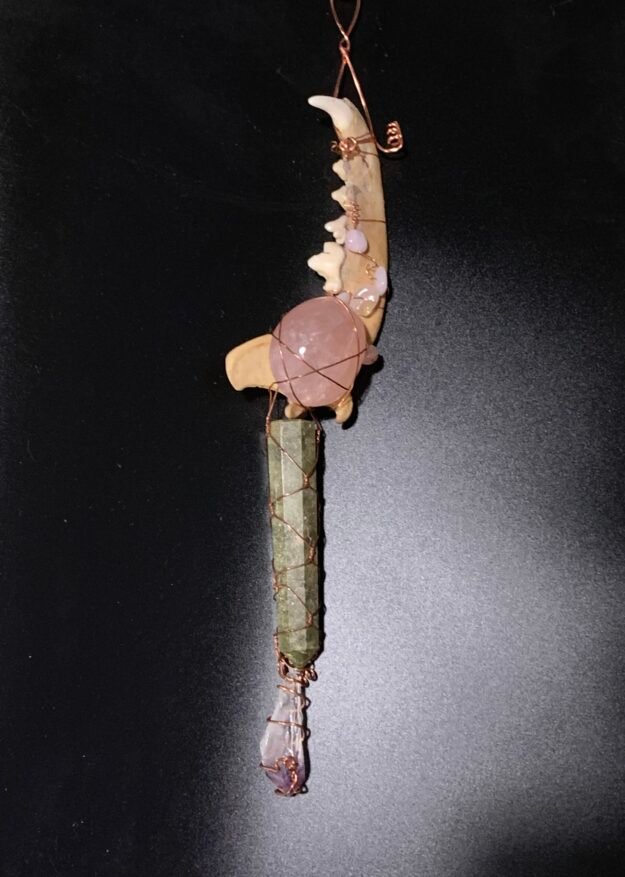 Pack is part of my Stones and Bones collection that are both art and talismans. It consists of a  coyote jawbone with morganite beads, star rose quartz tumble, zeosite tower, and natural amethyst point held together with copper wire. It was created intuitively with the intention of protecting the space it hangs in. It measures about 12 inches long.