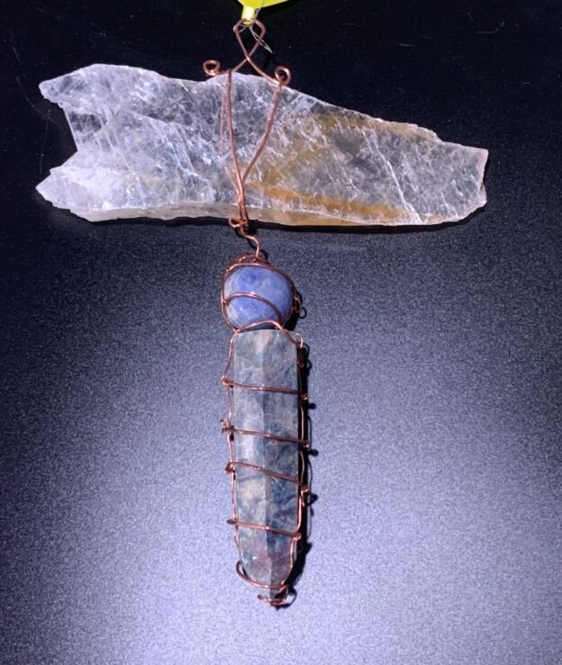Vision is part of the Stones and Bones collection, intuitively created protection talismans that hang on your walls. This piece contains a 6- inch wide slab of optical calcite, a blue quartz sphere, and a ruby in zeosite tower all wrapped in copper wire. It measures about 7 1/2 inches long.