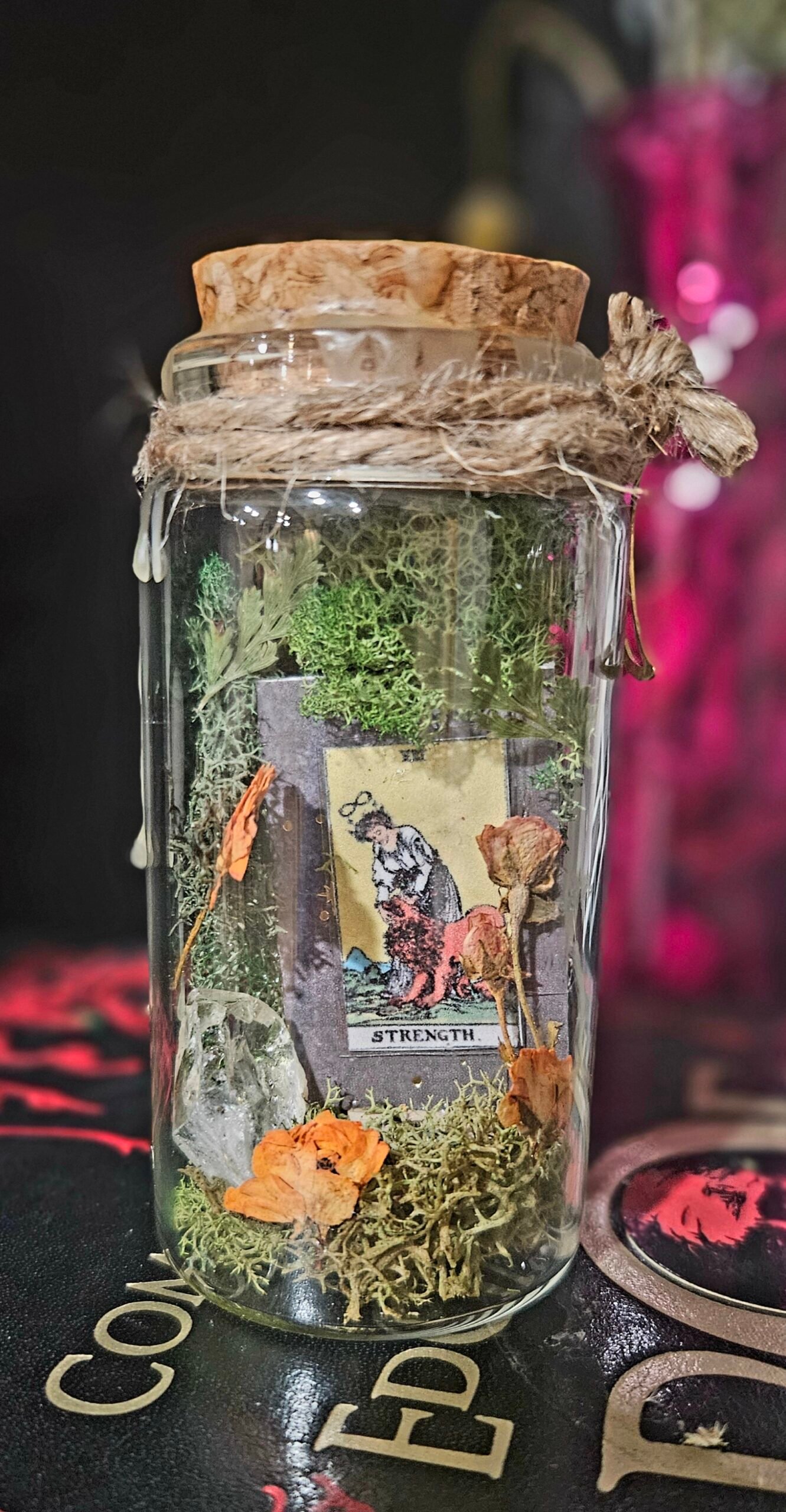 Bring the power of the Strength tarot card to your space with this enchanting Leo zodiac-inspired mini terrarium. Adorned with moss, crystals, and pressed flowers, this unique piece radiates resilience and vitality. Perfect for any Leo looking to enhance their surroundings with natural beauty and positive energy. Features raw citrine. This jar is 100 ml, 1.5 inches wide and 3 inches tall. The jar is sealed with twine and melted yellow wax.