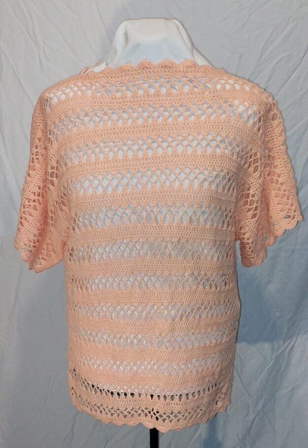 This vintage crochet top features timeless handcrafted details with delicate stitching and classic charm. Light and breathable, it offers a nostalgic, bohemian feel that pairs beautifully with modern or retro styles, making it a unique statement piece for everyday wear or special occasions. It measures approx. 21″W from under arm and 24″L. This is a size Large.
