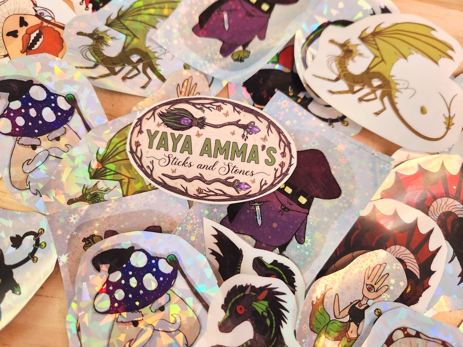 Stickers are larger, around 4×3 inches. Hand cut out, so approx size.